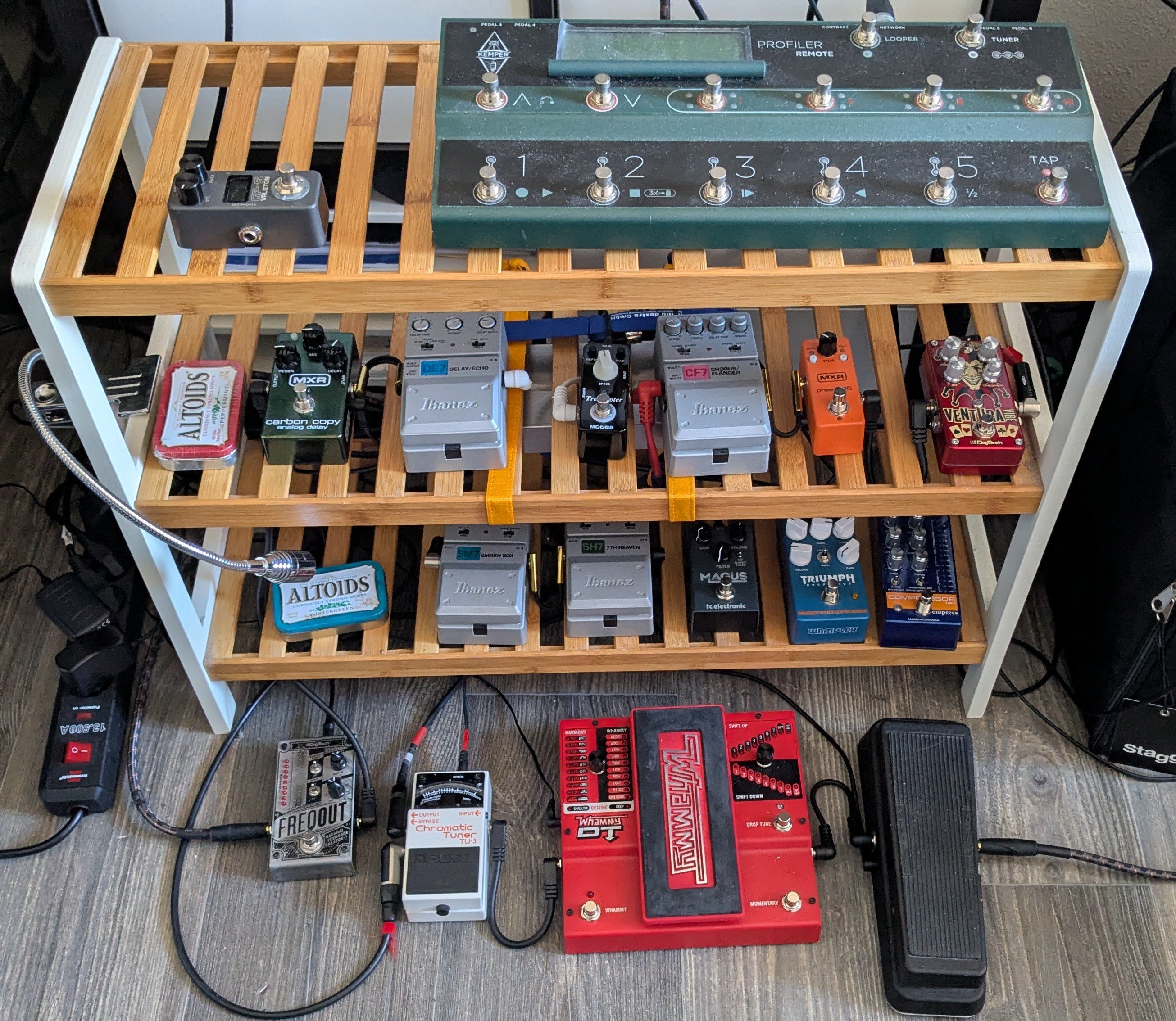 Die Altoid-Döschen sind Platzhalter für Distortion und Reverb. Oben, neben den Kemper-Prügel, kommt ein EQ (wegen Multiuse für Gitarre, Bass und Vocals wird's wohl MXR 10 Band EQ, auch wenn die Frequenzenaufteilung ein klitzekleines bisschen meh ist).