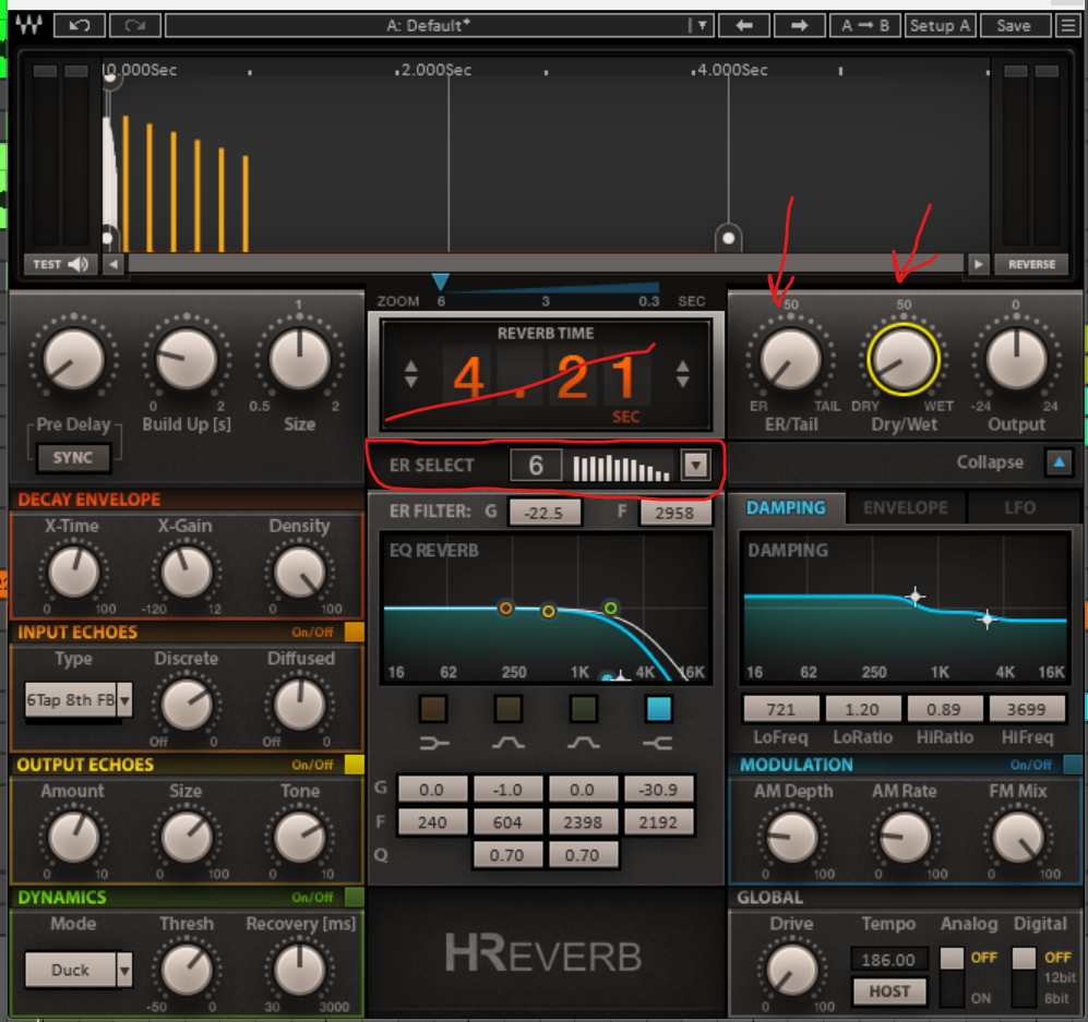 Hier hat man die Möglichkeit, den Tail auszublenden und kann aus einigen Vordefinierten Earlies auswählen, dezent dazufahren, sehr gut. Kommt v.a. bei Dosendrums sehr gut, wenn man alle Trommeln (Shells / Skins - halt keine Becken^^) auf einen Bus routet und den H-Rev dort mit z.B. dem Setting insertiert. Irgendwas zwischen 5-10% Wet (oder nach Gusto, ist klar), aber das lässt die Kessel ganz gut snappen, wie im Proberaum, wenn man blinzeln muss, wenn der Drummer die Snare schlägt.^^