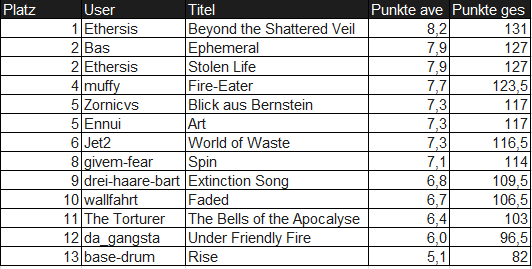 Auf jeden Fall danke an das Forum, dass ich durch diese Contests neue Sachen ausprobiere. Ansonsten hätte ich mich vermutlich nie wirklich an Gesang oder Texten versucht. Woran ich auf jeden Fall noch ganz doll arbeiten muss, ist Zeiteinteilung. Ich bin leider relativ untight, nehme Einzelparts immer in Loops auf und schnippel mir dann am Ende aus 10 oder noch mehr Einzeltakes die Spuren zusammen. Im Endeffekt wäre üben vermutlich doch zeitsparender. Oder mehr Toleranz bei Abweichungen von doppelgetrackten Gitarren? Wie handhabt Ihr das denn?