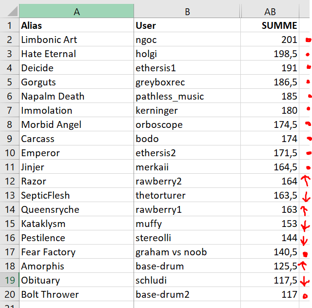 mir hat das Ergebnis gestern irgendwie keine Ruhe gelassen, da mir die Platzierung v.a. der Songs von Rawberry komisch vorkam. Mir ist natürlich bewusst, dass nicht jeder die Titel so gefeiert hat wie ich, aber es gibt "gefühlt" einen ganzen Schwung von Leuten, die den Sound mögen. Daher habe ich mal nachgezählt.