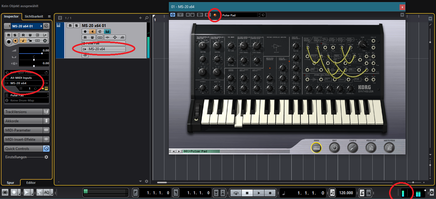 Guck mal ob deine Einstellungen (außer MS-20....) mit meinen roten Kreisen übereinstimmen, auch wenn Du eine Taste anschlägst.Anhang anzeigen 45990