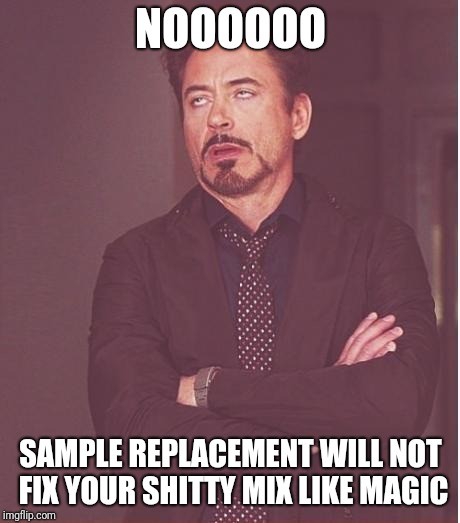 Wie gesagt, es ist ein Contest, es macht Sinn, alle mit dem gleichen Material arbeiten zu lassen. Es geht nicht um Replacement oder nicht, sondern darum, dass bei einem MIXING-Contest nicht die Sample-Library den Ausschlag geben sollte. Und darum den Zeitaufwand nicht ausufern zu lassen. Timingprobleme, fehlerhafte Drumspuren, Störgeräusche usw. sollten bereits vorab beseitigt sein.
