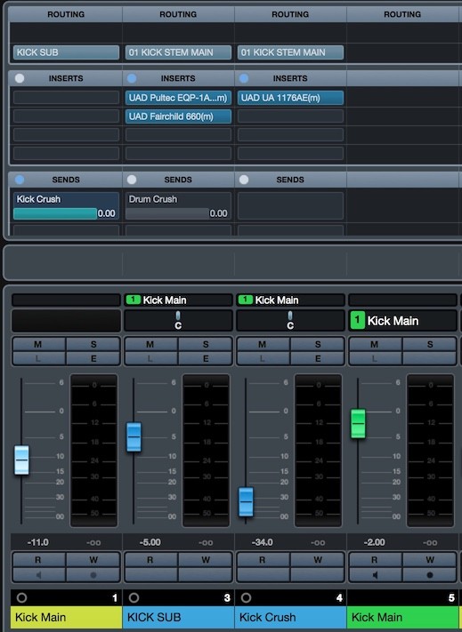 Von der Kick Main gibt es einen Pre-Fader Send (Pre-Fader, weil ich volle Breitseite haben will) in die Kick Crush (die wieder in die STEM). Dort sitzt als Comp ein 1176 im All Button Mode. Hier wird parallel komprimiert bzw. gecrusht und das resultierende Signal beigemischt.