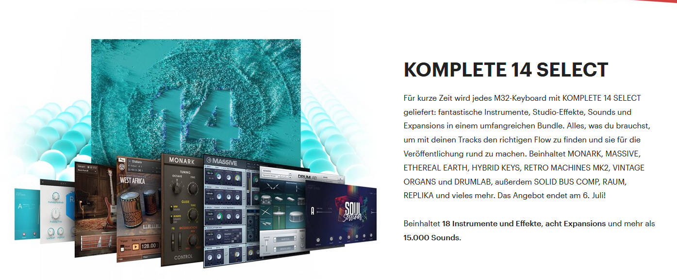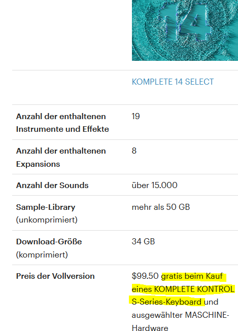 Ja, ist kein schlechtes Angebot wenn man noch nichts hat von NI. Das Keyboard ist wirklich ganz nett für den kleinen Arbeitsplatz. Ich habe eins für zuhause gekauft. (Habe aber schon eine größere Komplete Version...)Das Komplete 14 Select gibt's übrigens auch beim Kauf des kleinen M32-Keyboards (119,-) dazu:Anhang anzeigen 127874