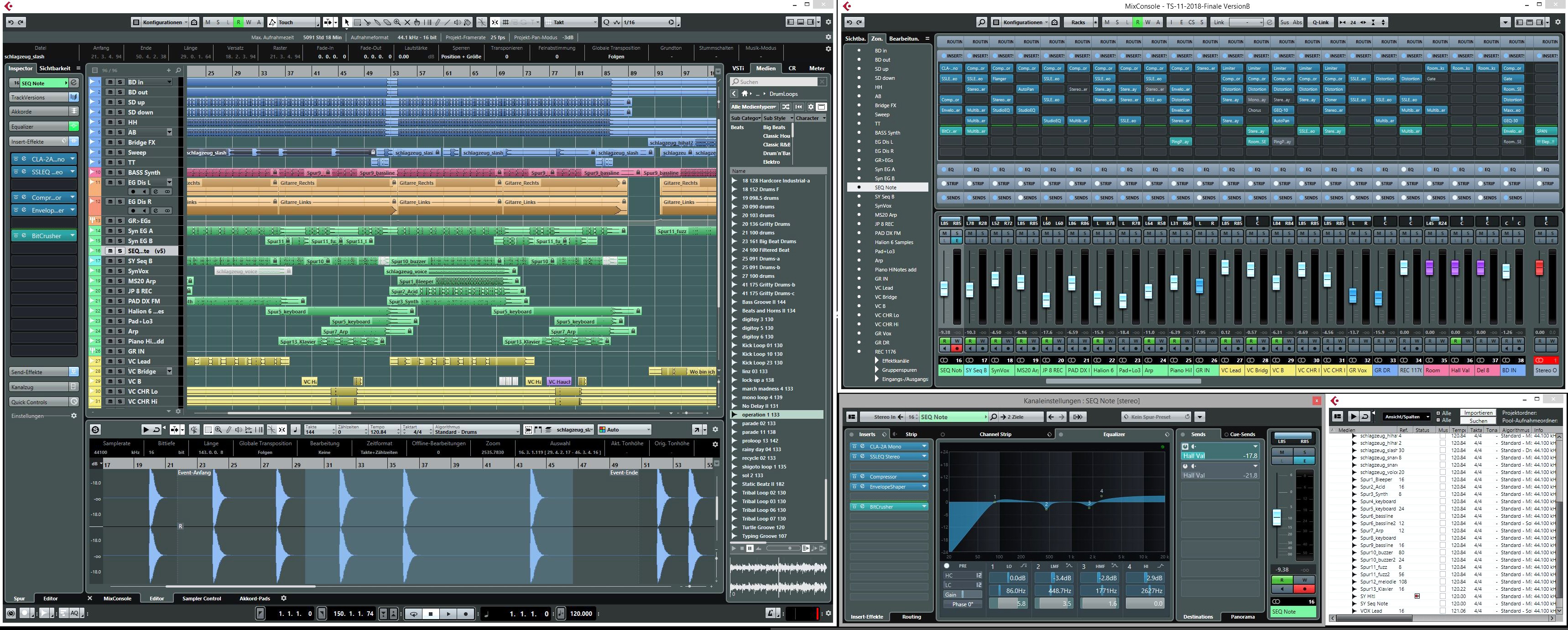 Jo auf dem Bild sieht man dass ich links und rechts noch Bildschirme habe, der rechts ist für den Analyser, die Bildschirme ersetze ich auch gleich mit 24.5Zoller, der links ist einfach ein zweiter PC der aber auch mit dem ersten PC verbunden ist und der Haupt PC ist dann nochmal verbunden mit 2 Server die außerhalb vom Studio stehen, ist halt günstiger und im Endeffekt schneller als jeder high end PC obwohl der PC selber recht alt ist.