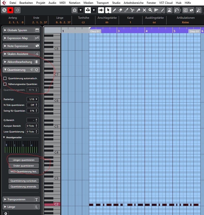 wie kann ich die Länge von Midi-Noten quantisieren? Aufpassen: Ich rede nicht von einer fixen Länge, also z.B. alle Noten auf eine 1/16 zu setzen. Ich möchte, dass Cubase das Ende der jeweiligen Note an das eingestellte Quantisierungsraster anpasst / quantisiert. Im nachfolgenden Beispiel sind 1/8- und 1/16-Noten vorhanden, während das Raster auf 1/16 gestellt ist. In S1 stelle ich einfach die Länge auf 100% und quantisiere. Wie geht es also in Cubase?