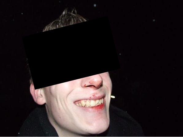 Allein dafür schon Platz 1 im Contest. Meine 10 Punkte hast du ungehört.Also ich habe mal einen halben Schneidezahn auf einem Beatdown Konzert verloren. Das war lustig. Wir haben eine Turtlemill gemacht. Das ist eine von uns erfundene Tanzfigur, wo man sich Rücken an Rücken stellt und die Arme ineinander verschränkt. Dann beugt sich einer nach vorne, sodass er seinen Hintermann trägt, der nun mit den Beinen in der Luft hängt. Das Ziel ist es nun, dass man sich schnell um die eigene Achse dreht und der Getragene dabei die umstehenden Menschen tritt. Ich war der, der getragen hat. Und ich war der, der sich zu schnell gedreht hat und dabei das Gleichgewicht verloren hat.