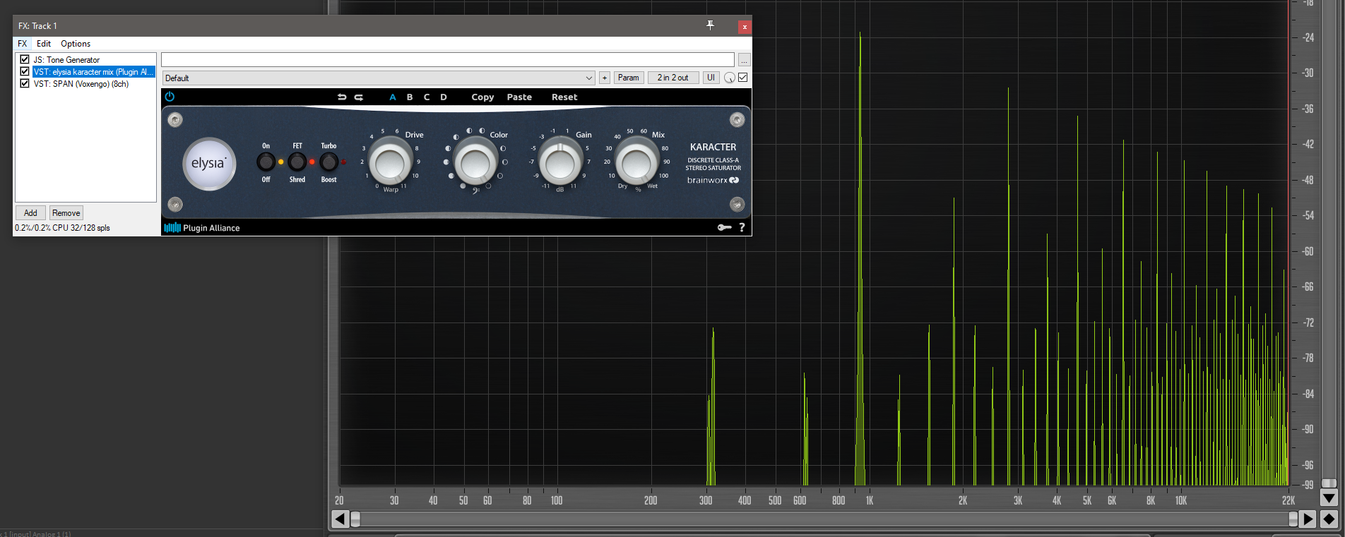 2. Willst du wirklich behaupten, dass du bei einem Distortion-Plugin, das du komplett und praxisfremd am Limit fährst, bei dem 48dB Abstand zum Nutzsignal liegen, tatsächlich das Aliasing hörst? Das glaubst du doch wirklich selbst nicht, oder? Ich will dir nicht zu nahe treten, aber das ist völliger Quatsch.