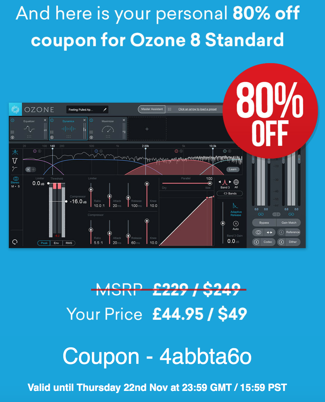The correct discount for anybody wanting to purchase iZotope Ozone 8 STD or Neutron 2 STD from Plugin Boutique this week is 60% off.