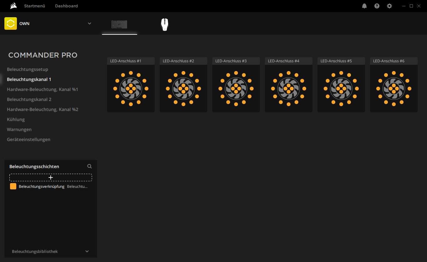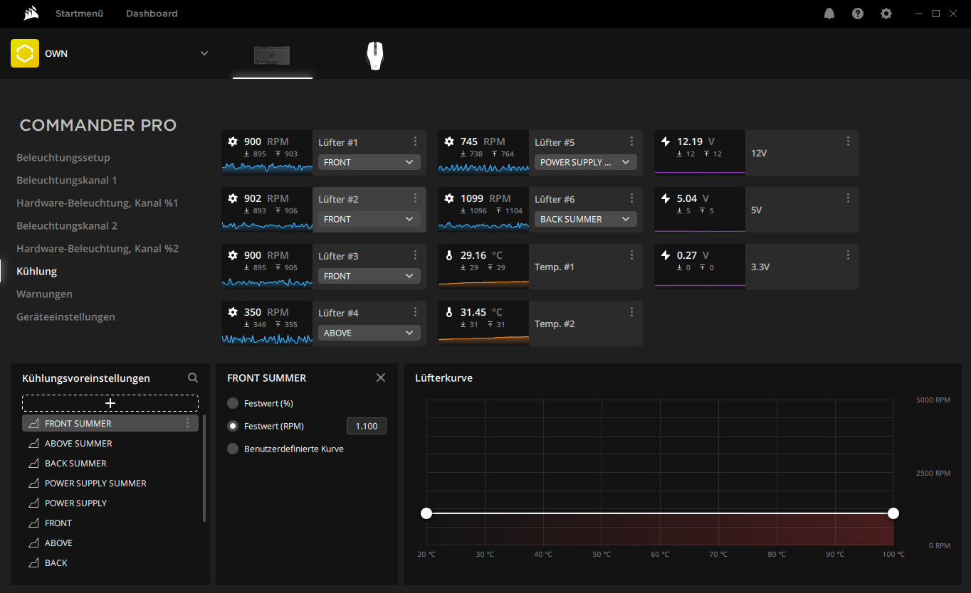 Der Commander PRO kommt noch einmal auf ca. 60 Flocken. Kostenpunkt also um die 280 - 300 alles in allem. Nett daran: wie man am Screenshot sieht, erkennt er auch meine Corsair Maus (über USB). Heißt: Mit dem Commander PRO lässt sich jegliches Equipment von Corsair ansteuern.