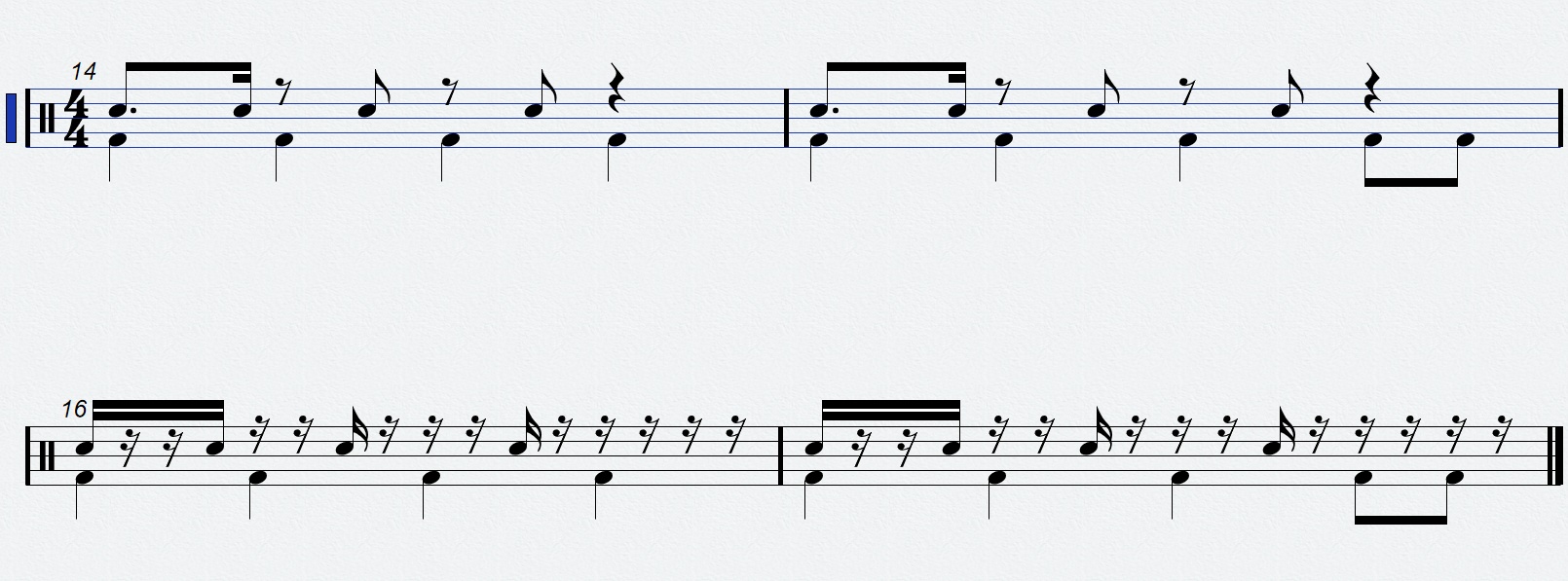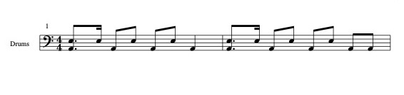 sachma wie notiert man denn den Rhythmus hier lesbar für Schlagzeug? Midi ist als zip angehängt. Ich hab das Gefühl Drum-Noten sehen sonst aufgeräumter aus. Ich hab für die Snare auch unterschiedliche Notenlängen probiert, ist das Usus oder nicht? Also oben wie unten finde ich nicht perfekt. Evtl. ist das Problem dass eine Hihat fehlt und somit kein Raster da ist?