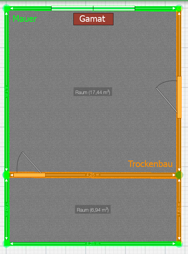 Nun weiß ich schon, dass die Raummoden bescheiden sind. Meine Frage ist daher, kann ich den Raum noch optimieren? Das rote ist der Gamat der an der Wand hängt. Die Wand mit Fenster wie links daneben ist eine massive Steinwand. Auf der gegenüberliegenden Seite ist Trockenbau und auch in Richtung Abstellkammer ist Trockenbau. Die Wände sind alle verputzt.