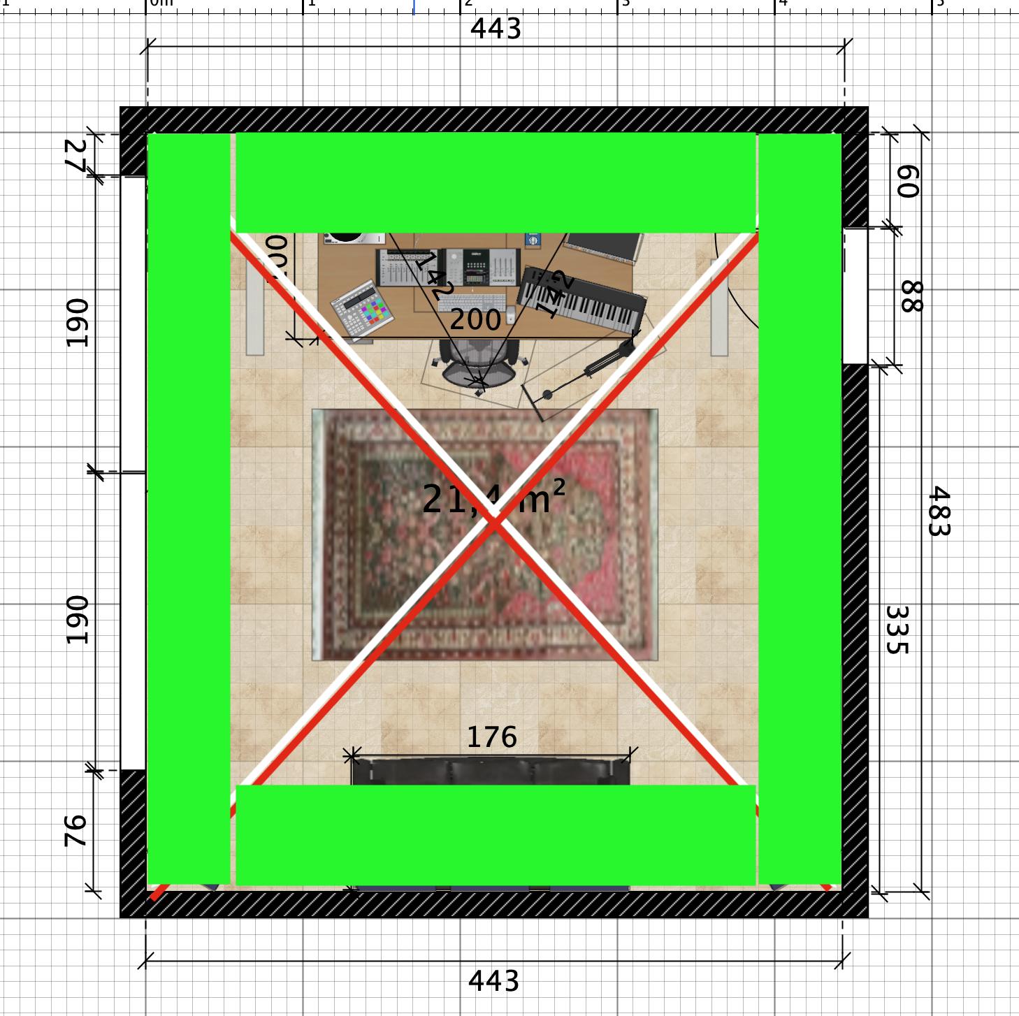 Bei dir ist es halt nun so dass beide Raumlängen so sind dass du doppelt "Nachhallpower" bei fast direkt nebeneinander liegenden Frequenzen hast. Und beide auch so tief dass man mit nur porösem Treatment halt wirklich schon im 50 oder 60 cm Meter dick Bereich sein wird um da was auszurichten - 50 - 60 cm dick über die ganze Wand...