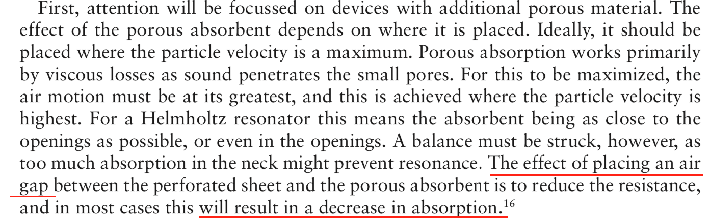 Wenn mich nicht alles täuscht, ist doch hier von echten Helmholtzabsorbern die Rede, und die haben doch wohl keine breitbandige tiefe Füllung, oder etwa nicht? Wenn dem so ist, dann sollte es doch keine großen Unterschiede machen.