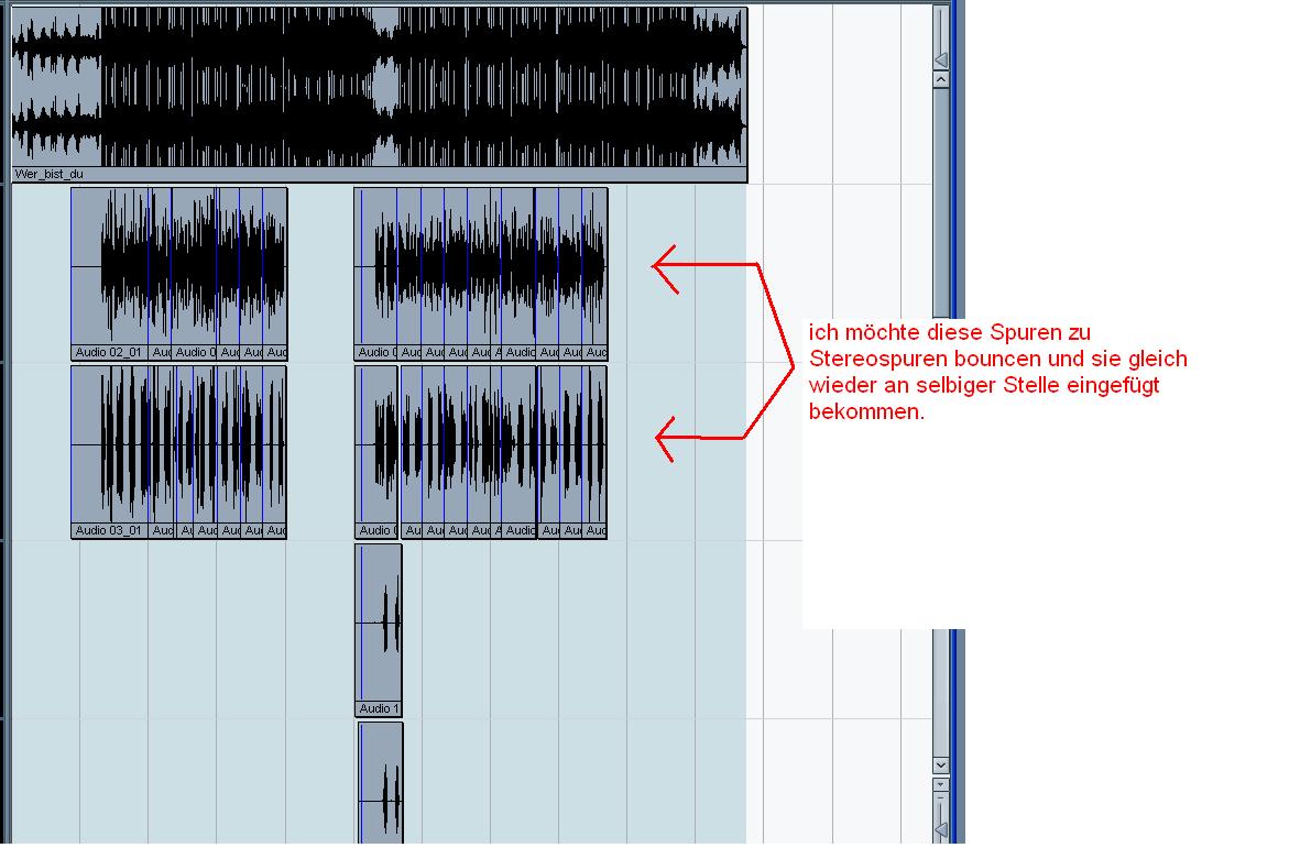 Und ich habe nun den Gesang in Mono und in mehreren Takes recordet. Jetzt möchte die ganzen Stückchen zu 1 Stereo Spur bouncen. Wie mache ich das?