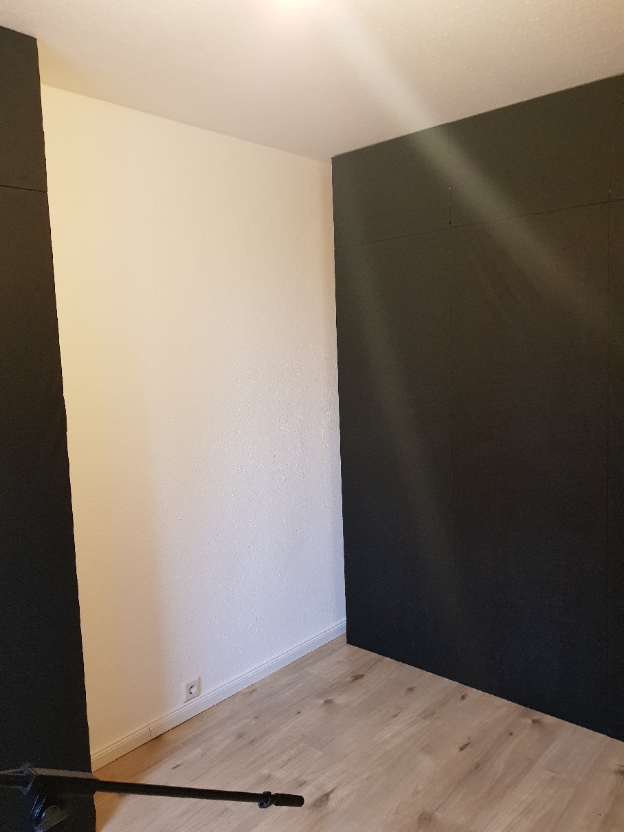 Es lohnt sich nicht immer das billigste zu nehmen was einen anspringt. Du hast jetzt an Erstreflexionspunkten über Steinwolle die absorbieren würde wieder was angebracht das reflektiert. Hättest du hier einfach sehr dünnes Gartenvlies und Dekomolton verwendet müsstest du gar nix mehr machen weil die Fläche fertig wäre. Jetzt musst du über die Absorber die in den Erstreflesionsbereichen stehen nochmal Erstreflexionsabsorber drüber bauen. Das kommt dich garantiert teurer als das gleich sinnvoll zu machen.
