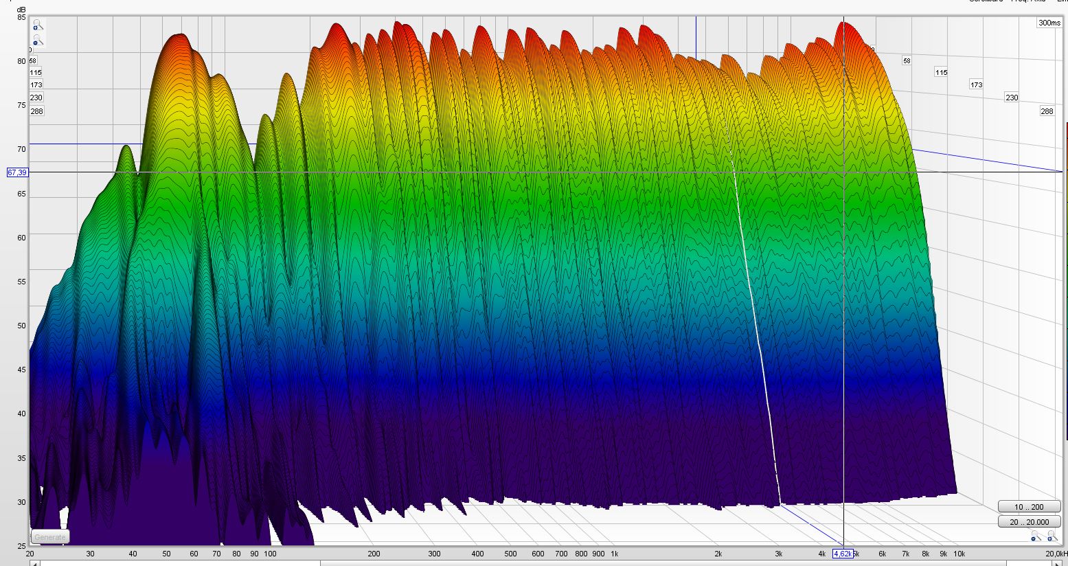 Hohlräume zwischen Kleiderschrank und Decke sind mit Dämmstoff ausgefüllt. Unterhalb der Dachschräge stehen 9 Pakete Sonorock von Ecke zu Ecke für hochkant, 3 Plattenbassabsorber an den Wänden, dort wo noch Platz dafür war. Rechnts von mir noch ne Couch. Über mir und rechts von mir je 2 Absorber. Über mir, hinter mir 4 Diffusoren. Das Ergebniss der Messung ist also sehr hart erkämft.
