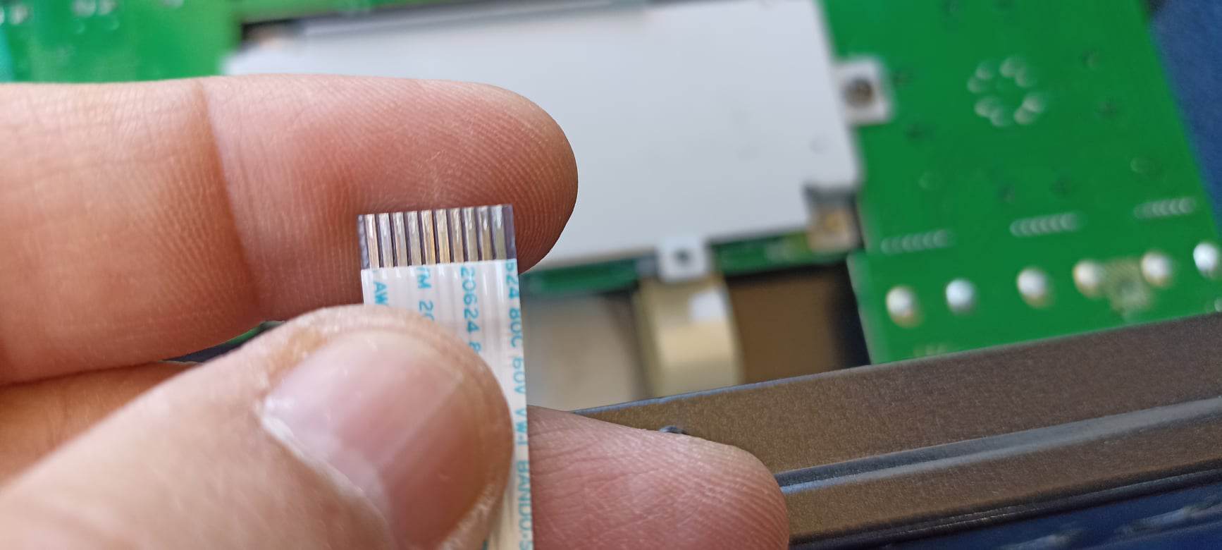 Die folgenden Bilder sind von einem französischen Leidensgenossen eines TD-12. In meinem Fall war eine die beiden FPC Leitungen des Displays das der Kollege in der Hand hält betroffen. Ich habe diese mit Alkohol und einem Tupfer gereinigt und anschließend fotografiert. Ihr müsst vorsichtig sein und dürft nicht mit zu viel Druck an Steckern arbeiten, da die aufgedampften Verbindungen nicht sehr robust sind. Man kann die Steckverbinder mit einem scharfen Cuttermesser und einem Lineal zur Anlage oder einer Schere vorsichtig etwas kürzen, wenn Leiterbahnen - wie in meinem Fall - sichtlich beschädigt sind. Aber Achtung, zu viel dürft ich nicht wegnehmen, weil die Leiterbahnen dann isoliert bzw. in den Kunstsoff mit eingearbeitet sind. Außerdem müsst ich möglichst parallel schneiden damit der das Flachbandkabel wieder optimal in dem FPC Stecker sitzt.