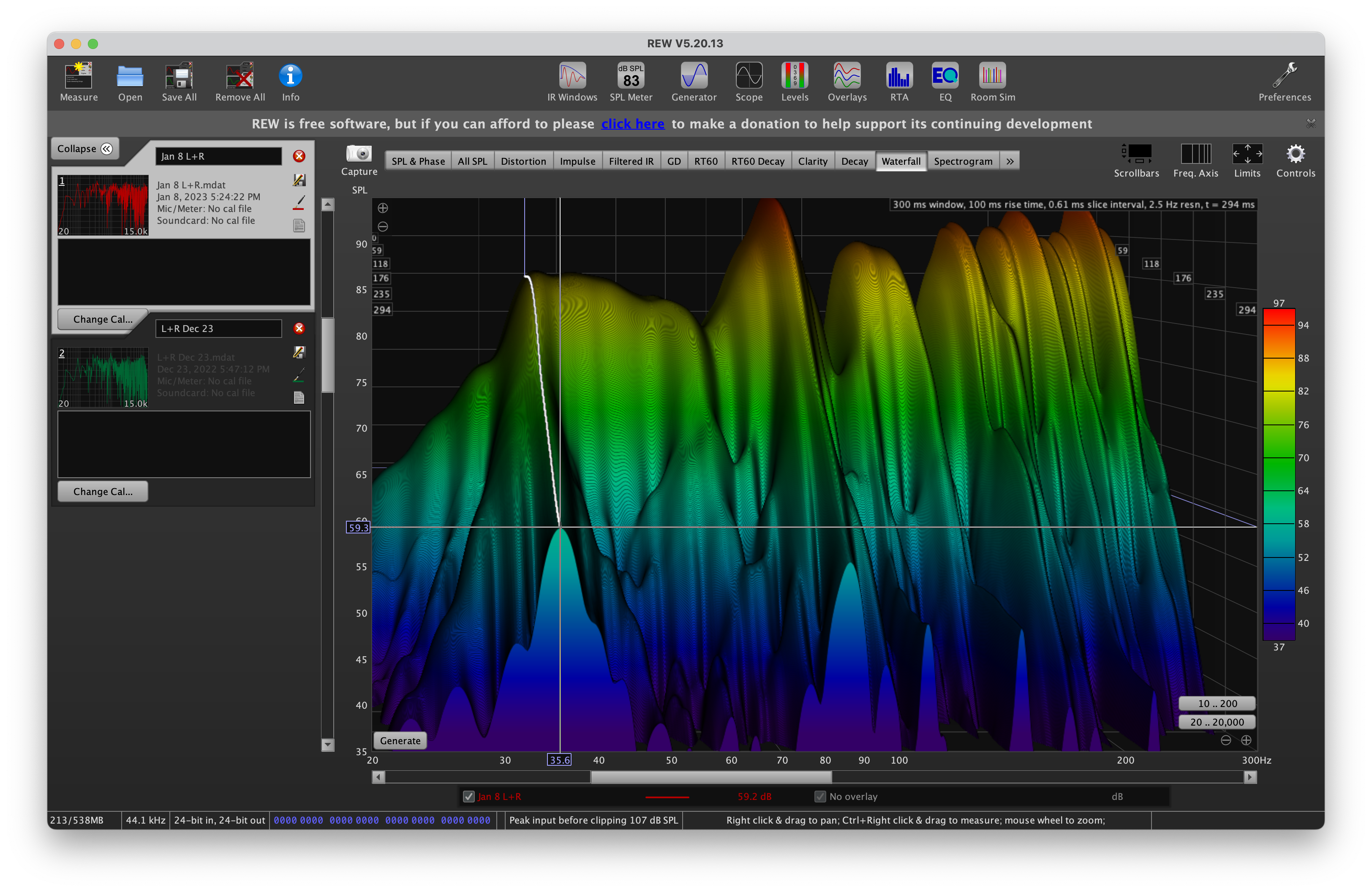Im Bass haben meine beiden Basstraps nur ein wenig ausrichten können, die 35 Hz und 85 Hz sind nach wie vor messbar, aber immerhin unter die im Tutorial besagten"mindestens 60db nach 300 ms" abgeklungen.
