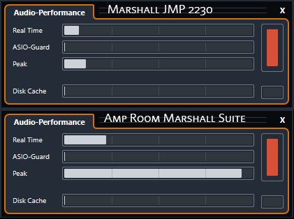 Hab jetzt mal verglichen. Der Cubase ASIO-Guard ist beim Amp Room, wie du siehst, ca. 4x höher in der Auslastung.