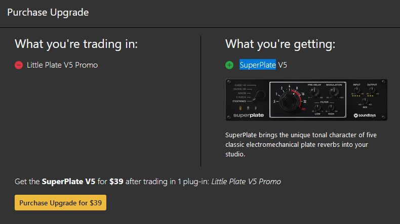 Hast denn auch die trade in Option gewählt, oder Upgrade?Also ich habe nach dem upgrade und der Installation von 5.4 sowohl Little Plate als auch SuperPlate im Soundtoys VST Ordner, nur falls da jetzt jemand verunsichert ist.