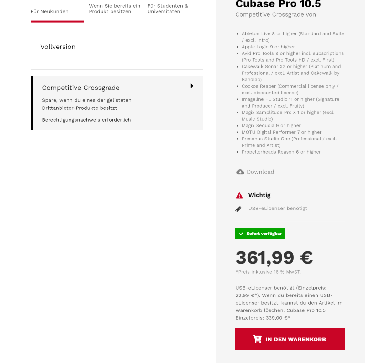 Aktuell kostet das Crossgrade 339€ im Steinberg Webshop.Ne, ich hatte mir ja vor kurzem das Crossgrade angeschaut, da waren es 358,99€ jetzt sind es 361,99€.