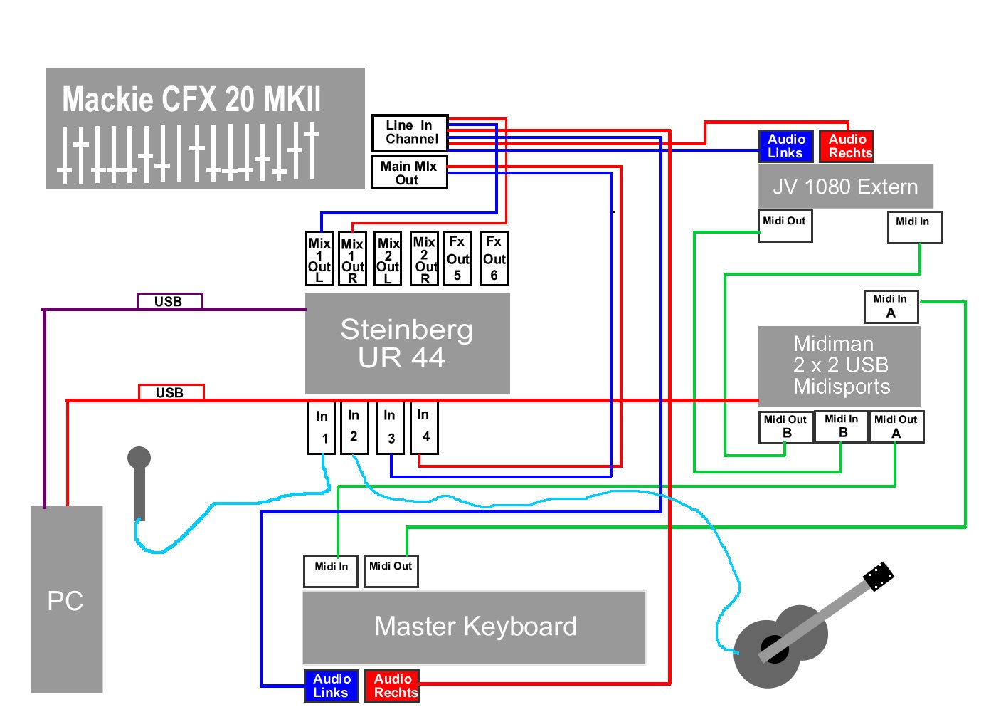 Alles getestet. Würde ich das Kabel, welches als Stereo Mix vom Mischpult kommt an eine Endstufe legen, hätte ich vollen Saft. Die UR 44 reagiert bzw. gibt den Sound nur aus, wenn ich mein Keyboard in den "Local On" Modus bringe. Aber das kann es doch nicht sein...