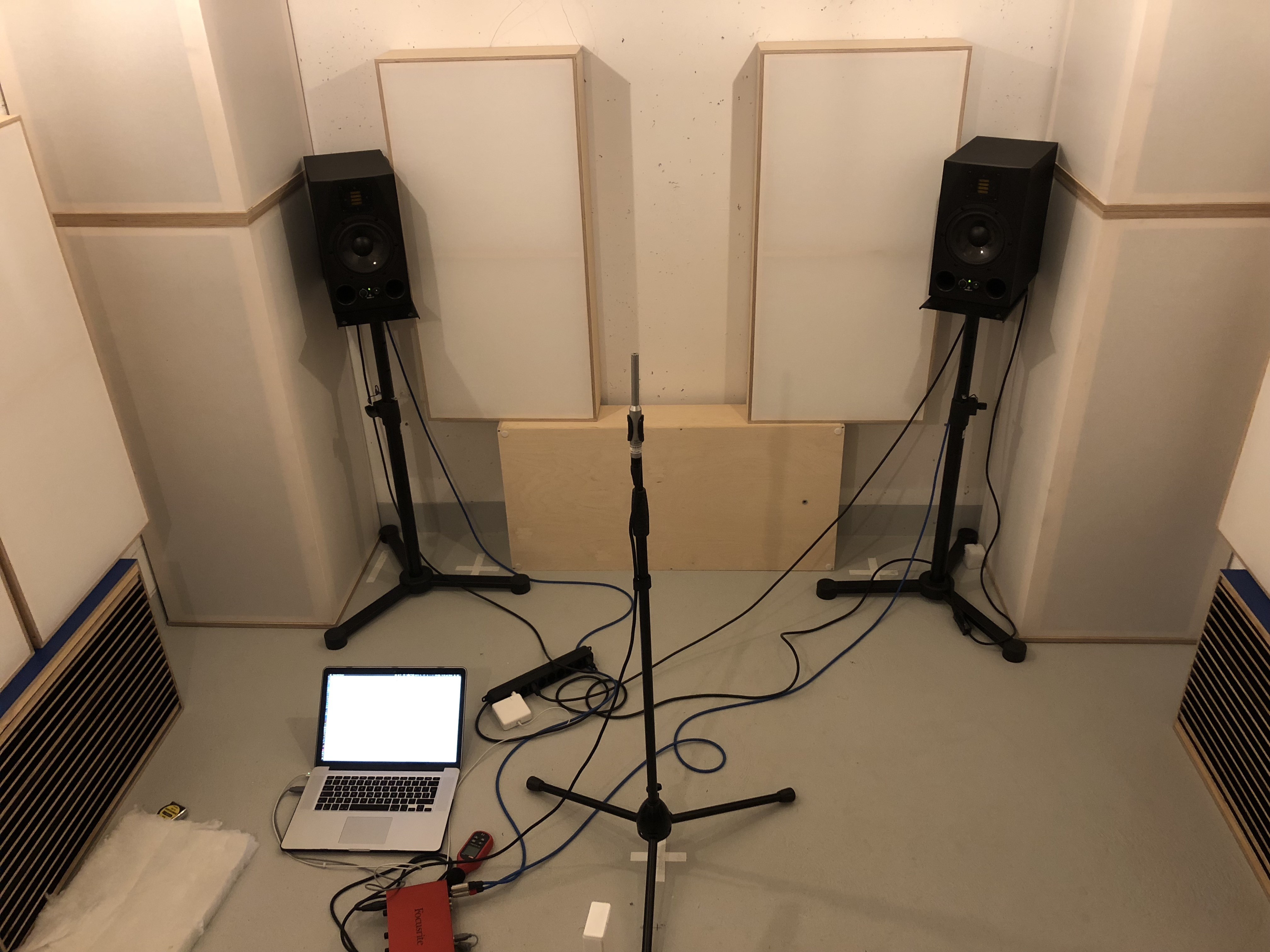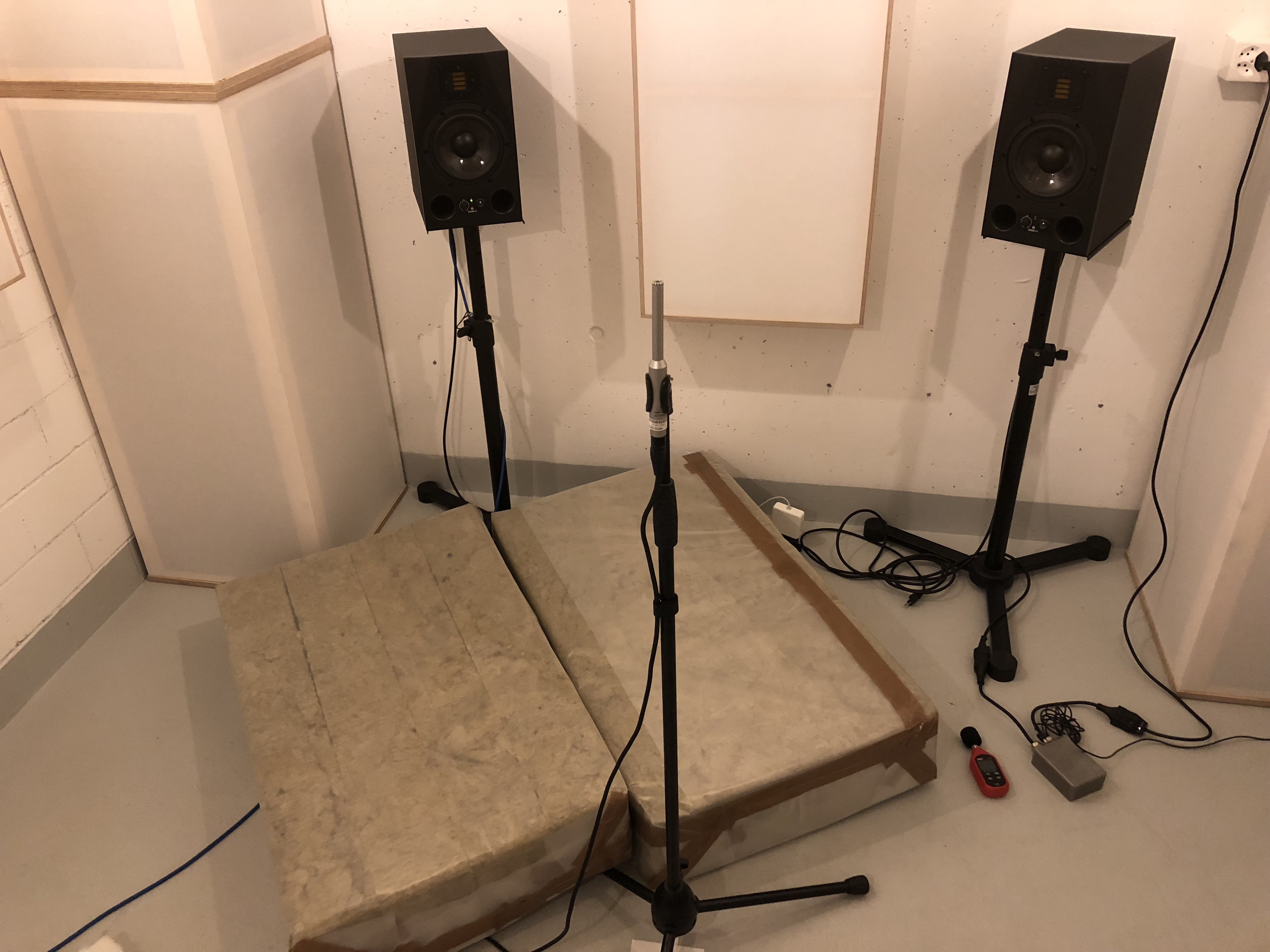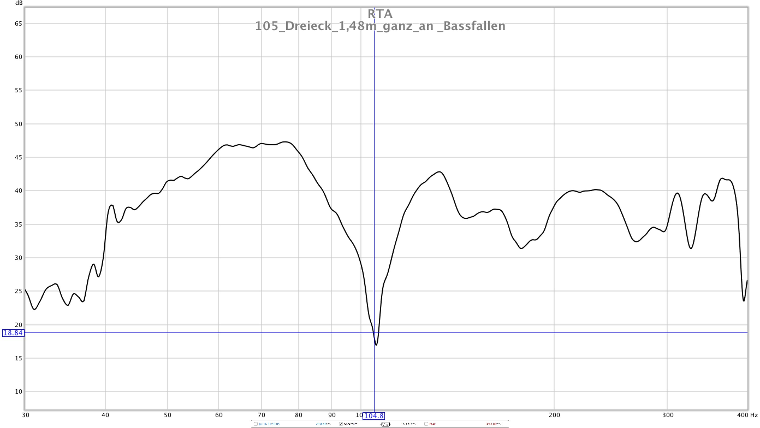 Stereodreieck (rot): 1,48m (Speaker ganz an Bassfalle, ganz an Wand)