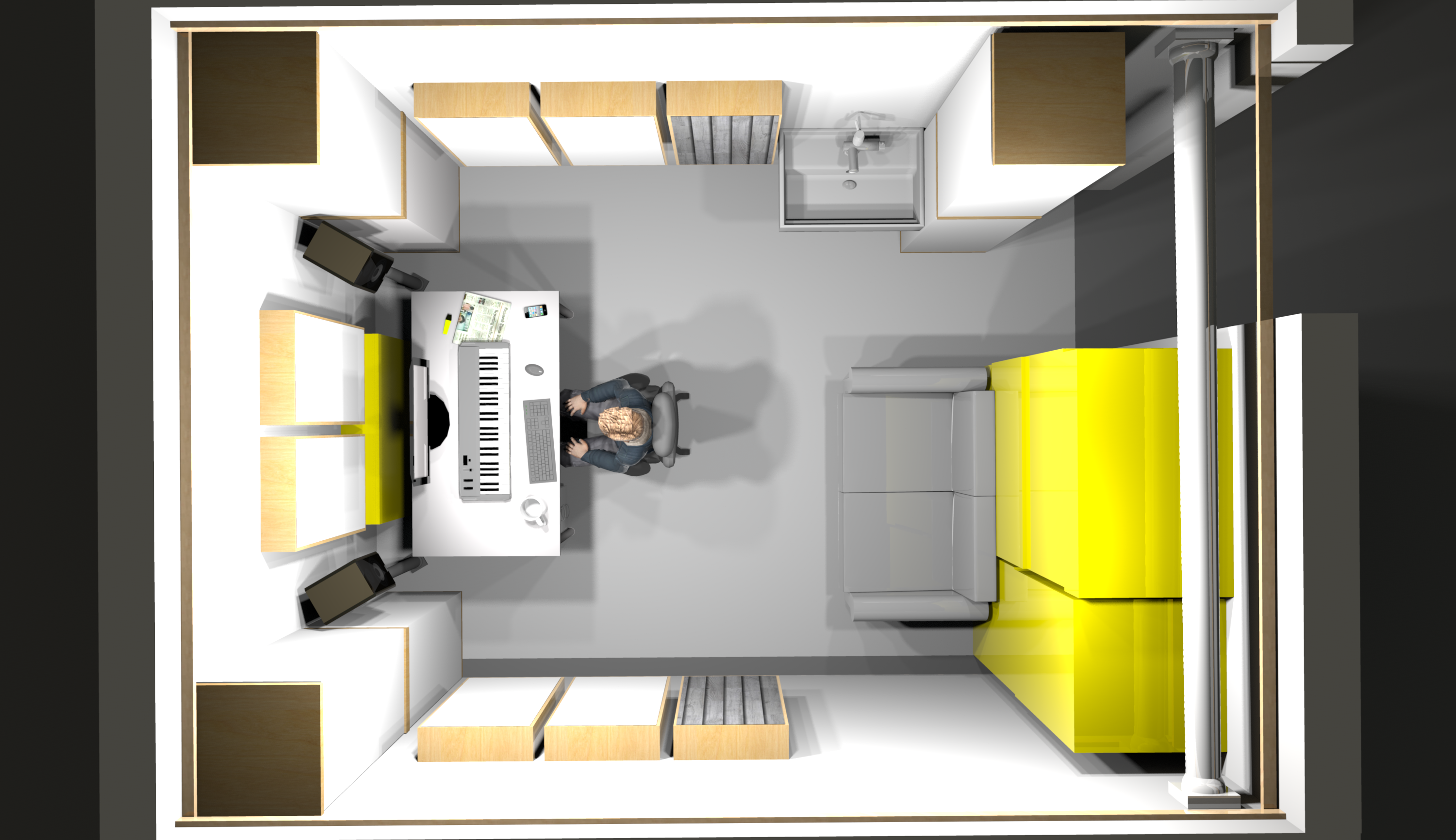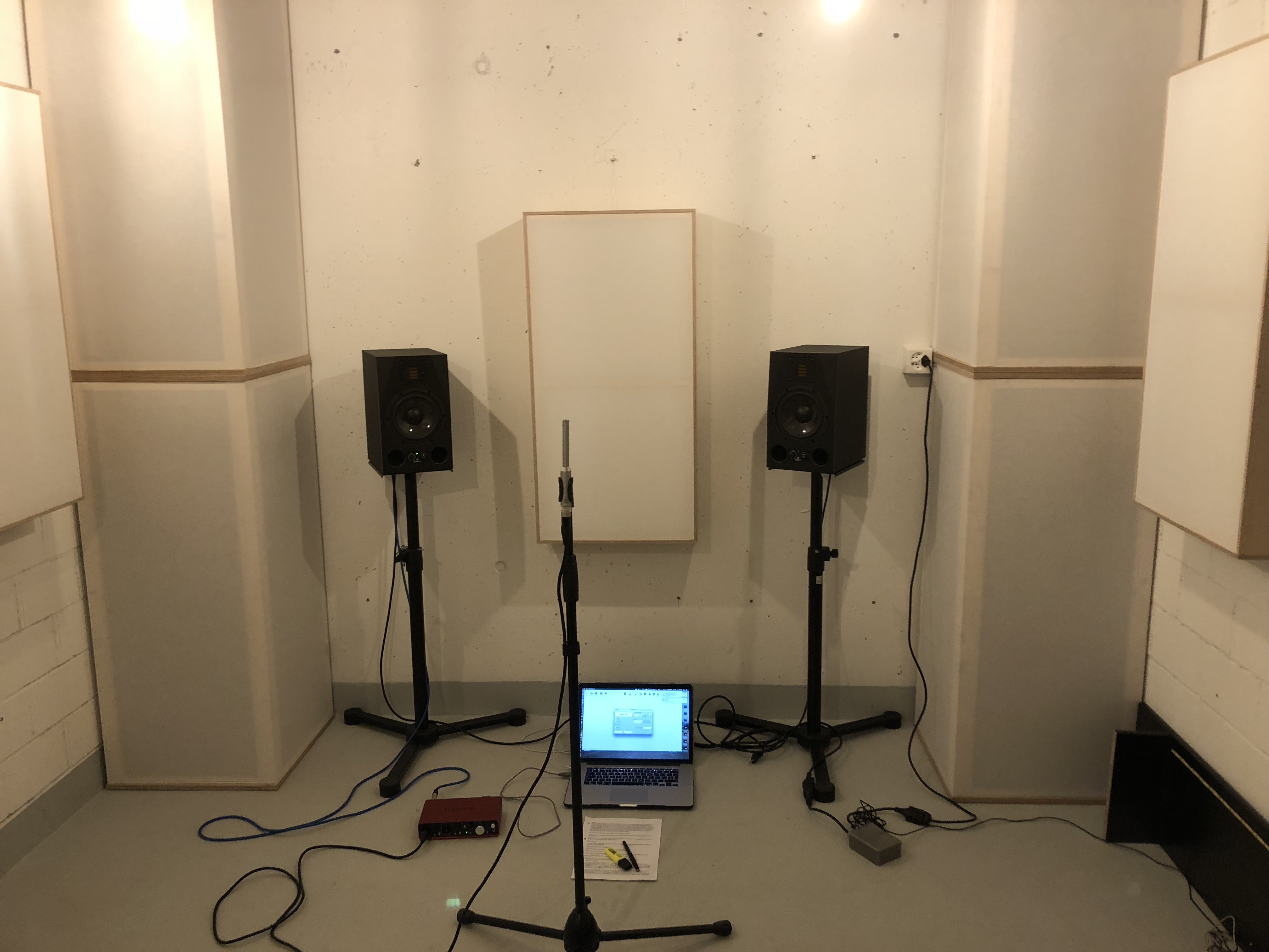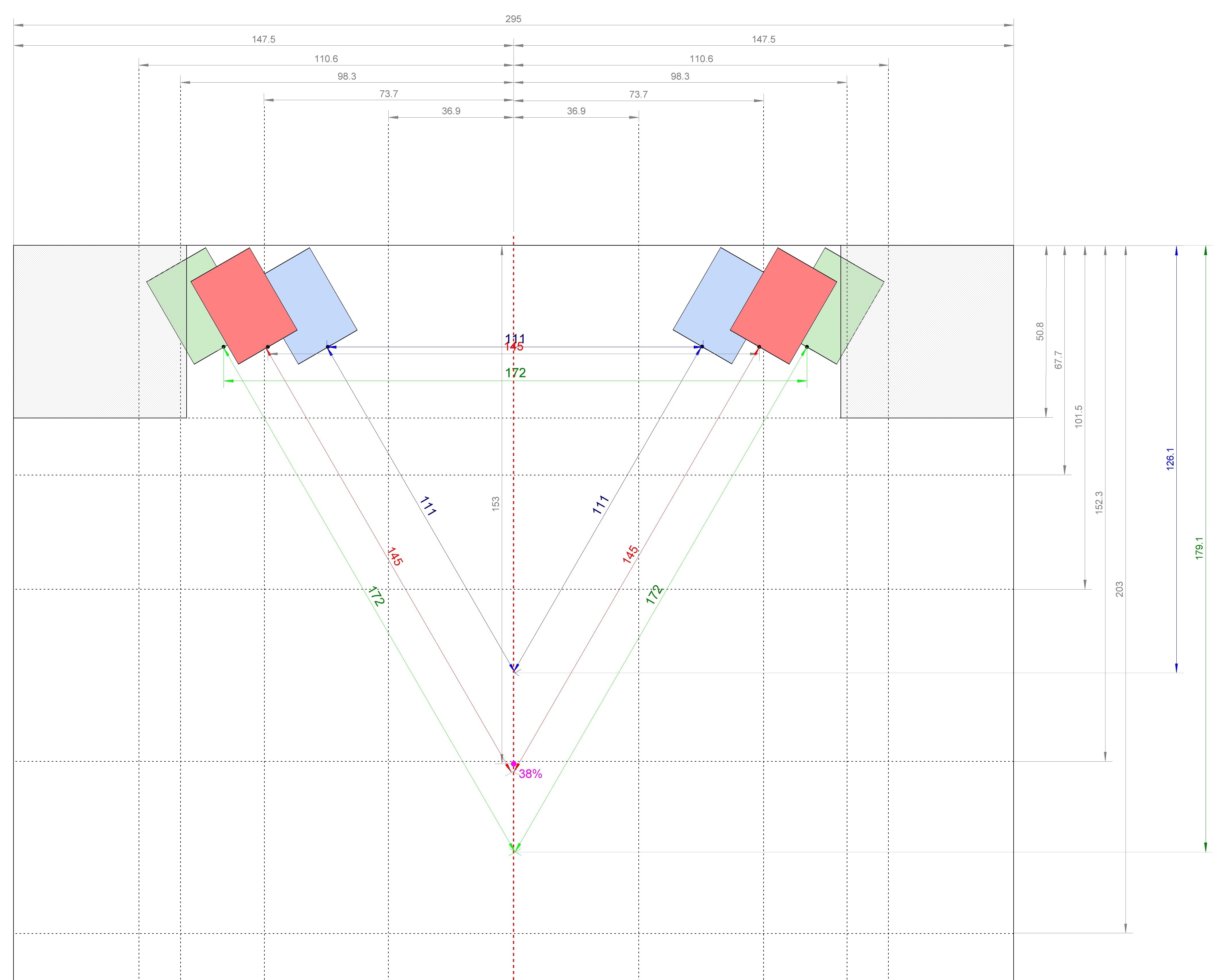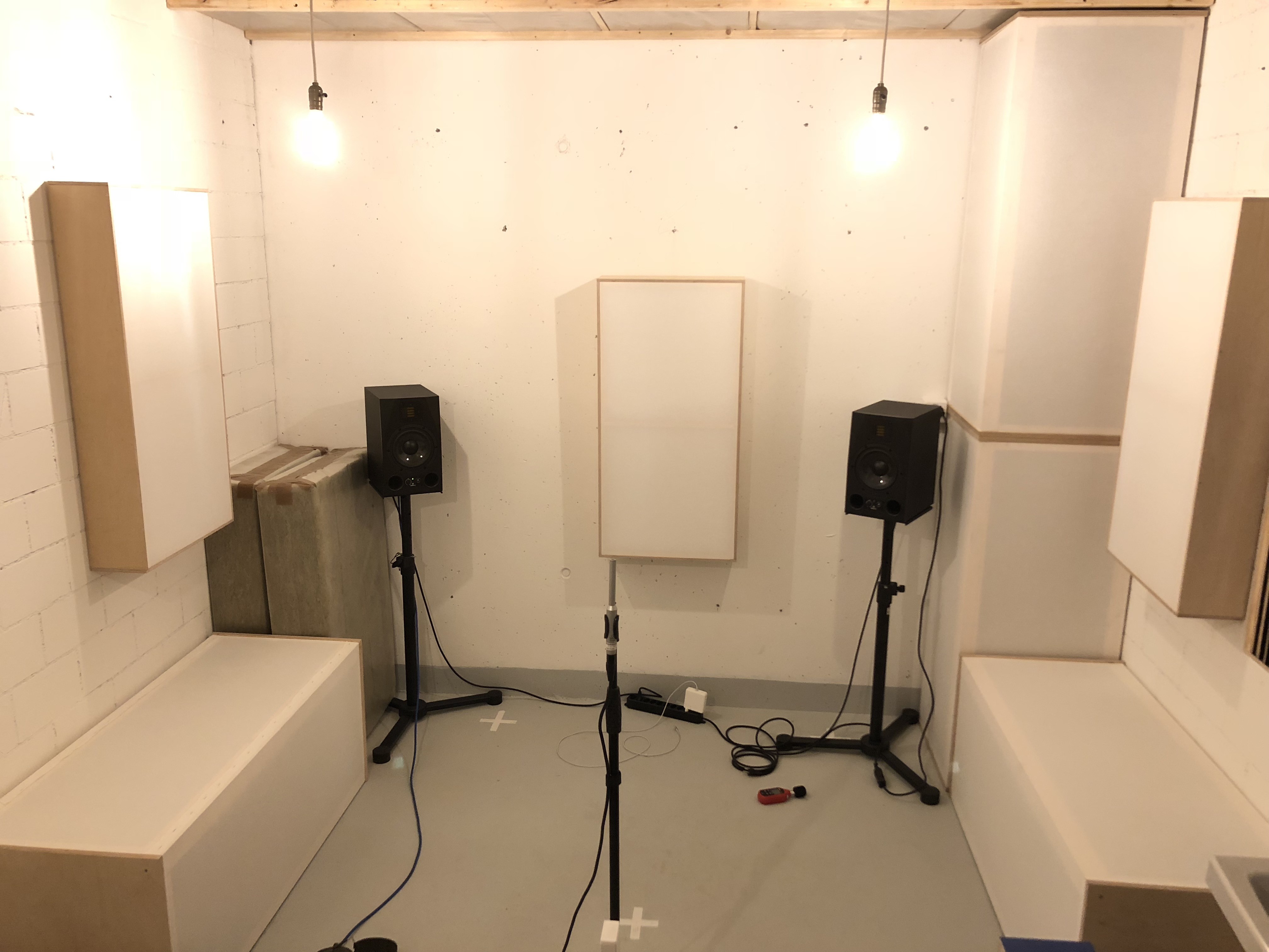 Stereodreieck (rot): 1,48m (Speaker ganz an Bassfalle, ganz an Wand)
