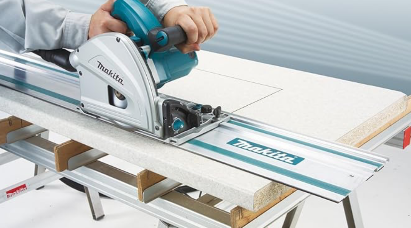 Hole dir irgendeine Handkreissäge mit Führungsschiene. Damit kann man sehr gut Plattenzuschnitte machen: