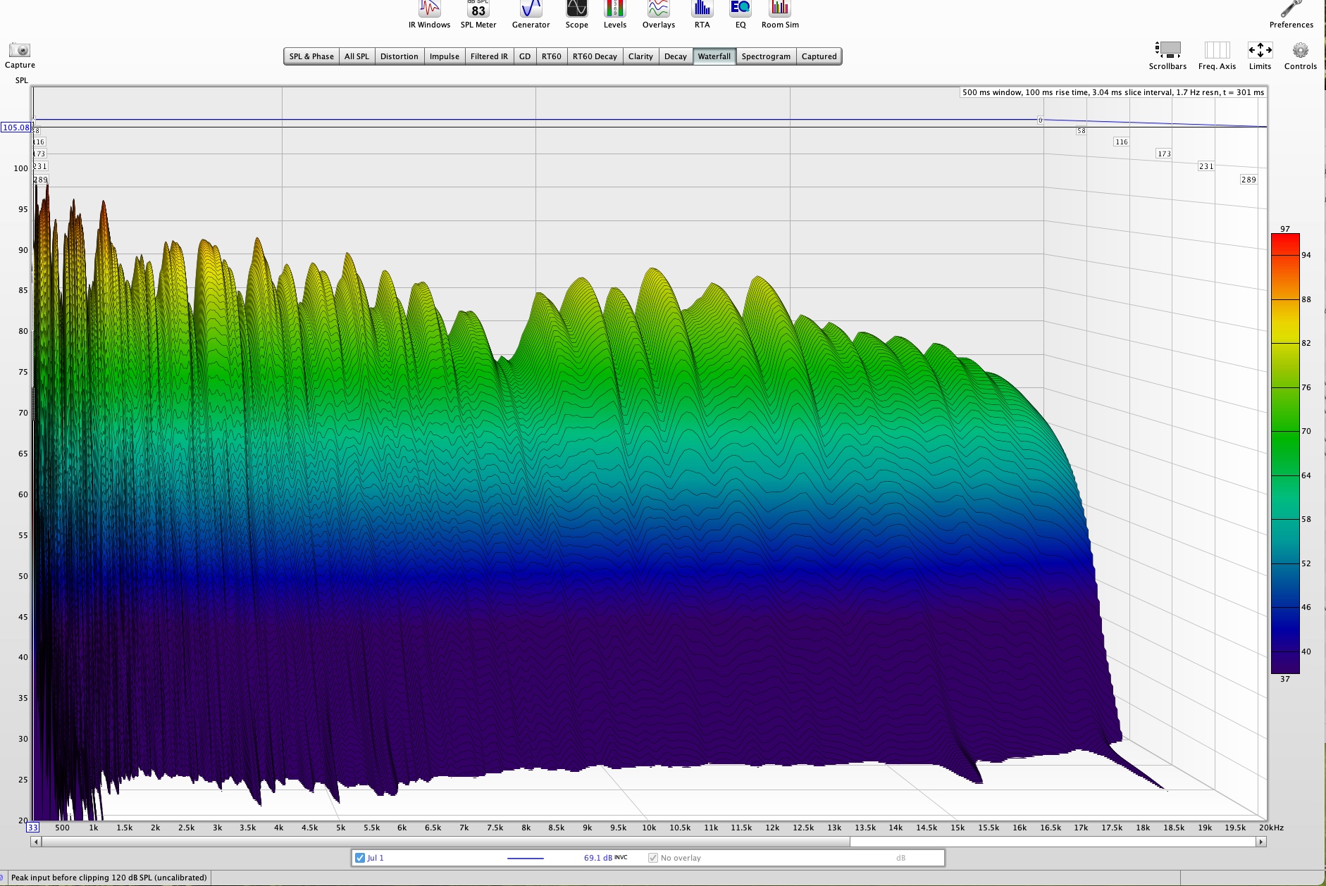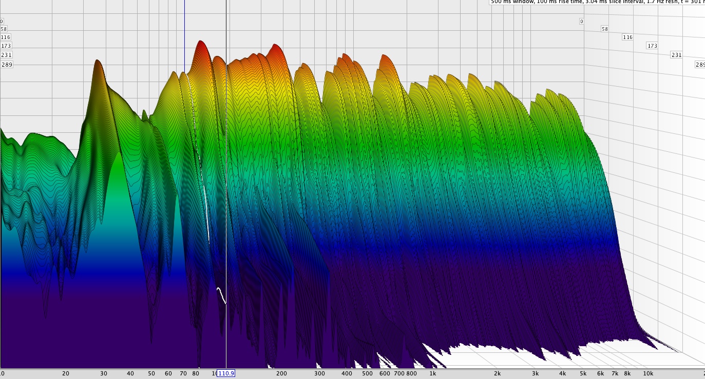 - Bassbereich typische Berg und Tal Fahrt bei unzureichend gedämpften Moden (hier vorwiegend Berge) und keinen echten Maßnahmen gegen SBIR (hier tiefe Täler) = ist hier eine Range von 30 db im Bass vom höchsten Peak zum tiefsten Notch, das kann kein Hirn wirklich ausgleichen