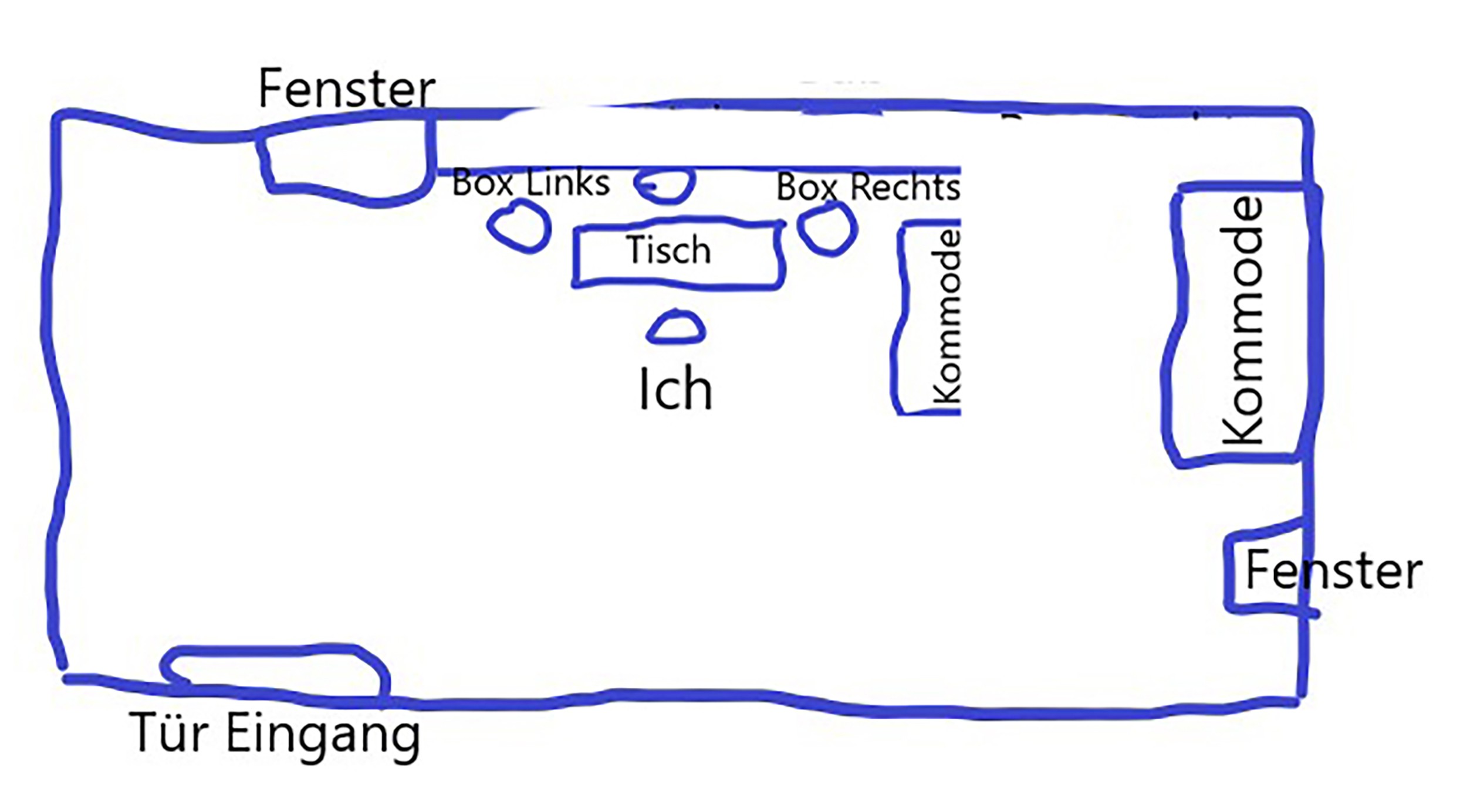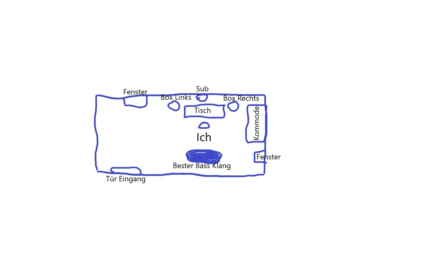 Der Sub steht aktuell direkt in einer Linie zu den Monitoren. Dort wo ich "Bester Klang Bass" geschrieben habe hört sich der Bass am saubersten im ganzen Raum an. Jetzt habe ich gelesen, dass ich dann dort den Sub hinstellen sollte. Aber dann würde er ja mitten im Raum stehen...