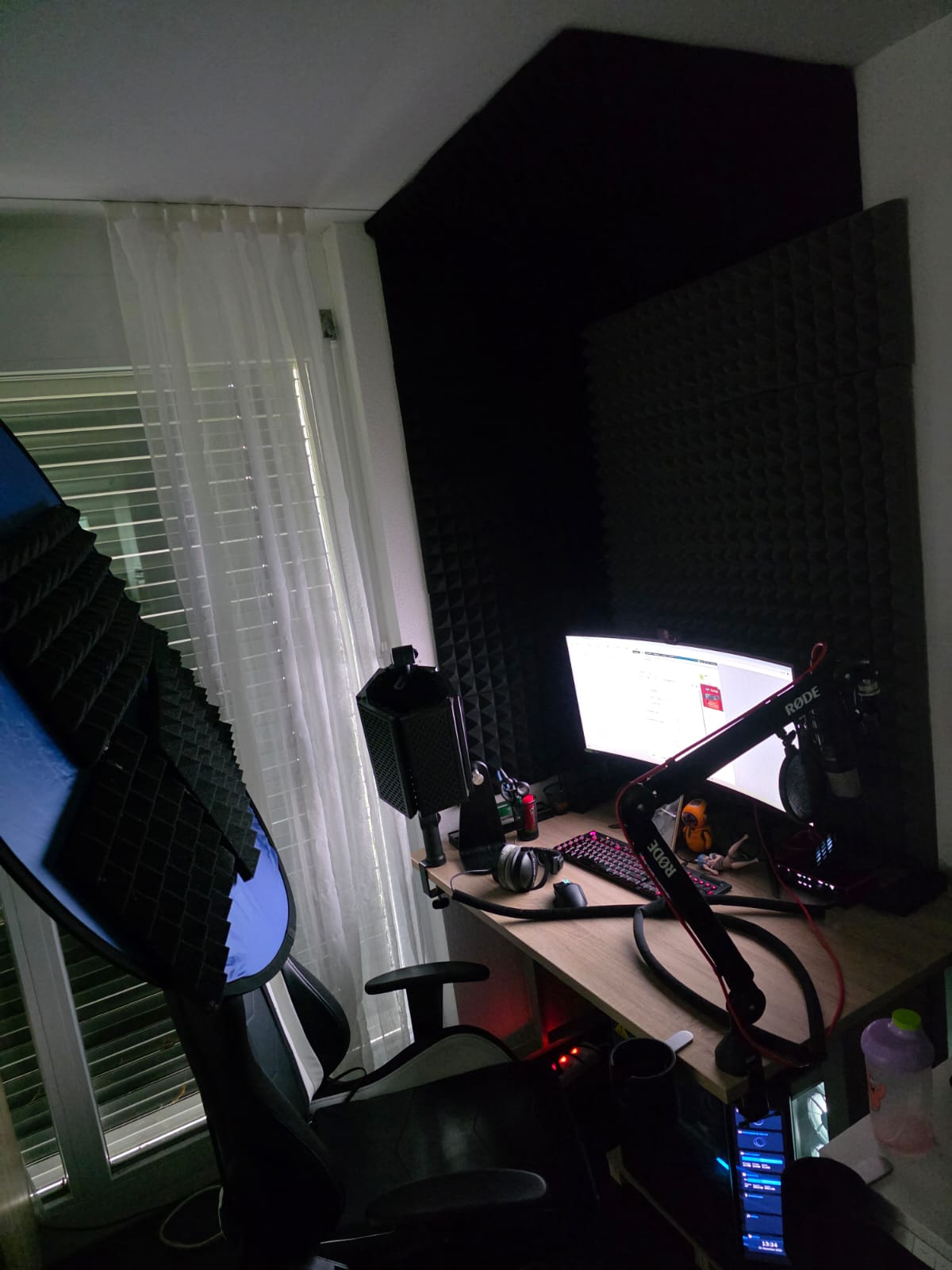Dazu habe ich ein RØDE NT1, ein Scarlett 2i2, und experimentiere aktuell mit einer Art Mini-Isolation um das Mikro herum.