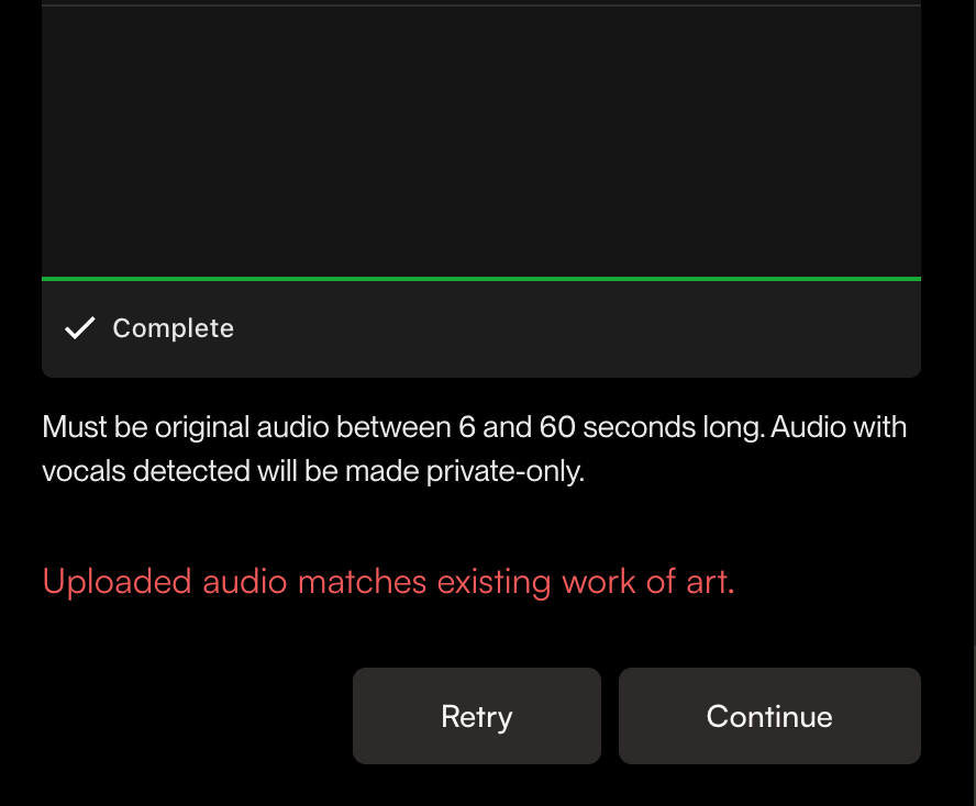Beim zweiten Versuch es hochzuladen in SUNO AI wird es wieder abgelehnt.