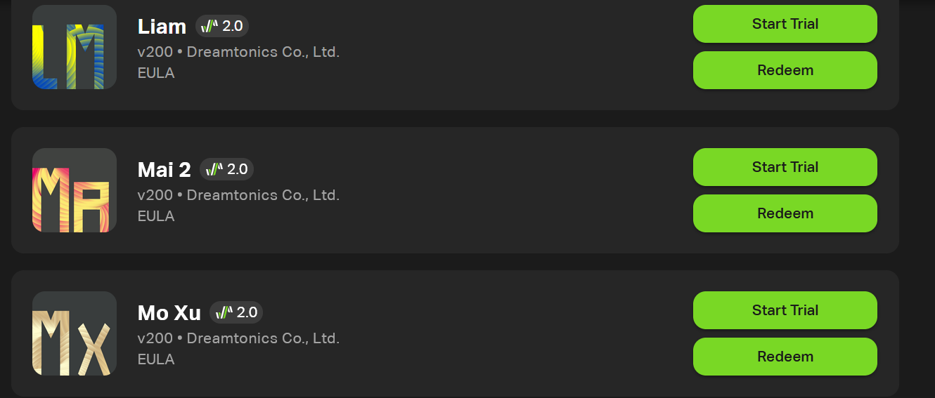 Bei mir funktionierte das Redeem für Liam ohne Probleme. wie auch der "Download" von den beiden Eclipsed Sound Voice Upgrades ohne Probleme. In Synth V 2 dann einfach auf den Cloud Button klicken und dort Install anklicken.