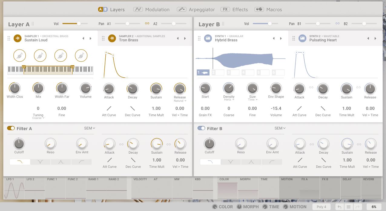 Die Oberfläche braucht auf den ersten Blick sehr viel Platz für sechs Drehregler. Der Sinn daher erklärt sich später. Jedes Instrument besteht aus zwei Layern: A und B. Die Haupt-Oberfläche macht die Bedienung kinderleicht: Einfach spielen, an den Reglern spielen und Spaß haben. Schon beim ersten Anspielen wird das Konzept klar: Man nehme echte Bläser-Samples und jage diese durch den Wolf. Dazu noch eine Prise synthetische Bläser, und schon hat man ein schönes Hybrid-Instrument.