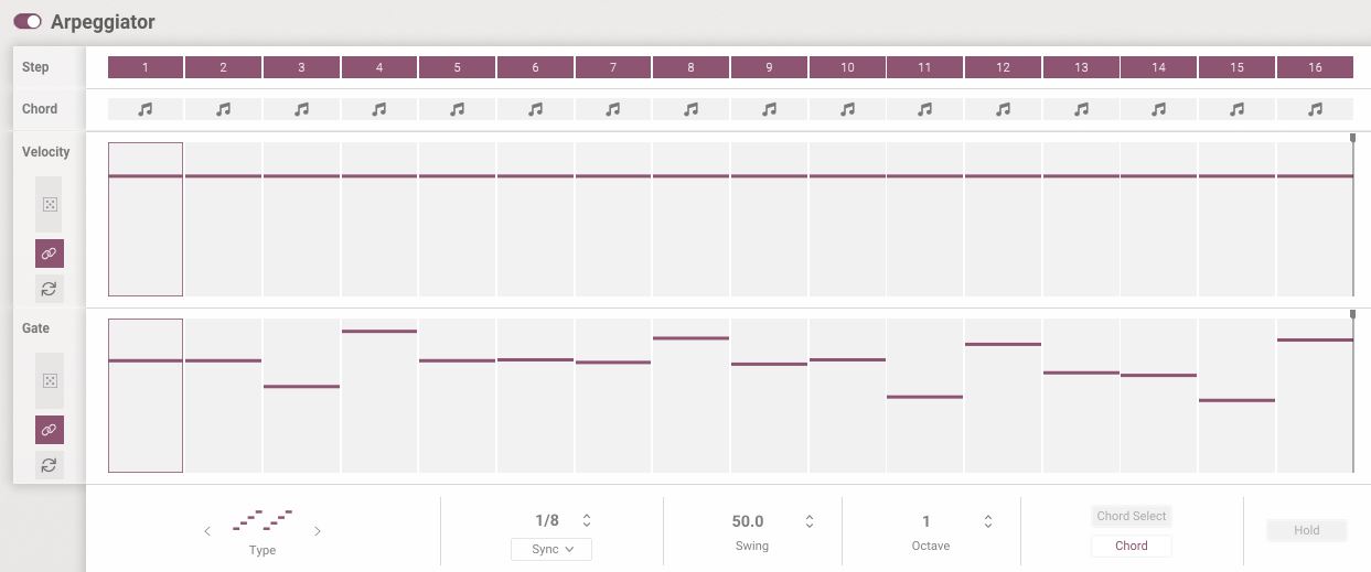 Die 16 Schritte scheinen fix zu sein. Hier hätte ich mir etwas mehr Eingriff ermöglicht. Jeder Step lässt sich stummschalten, womit lebendigere Rhythmen möglich sind. Das Notensymbol lässt einen Akkord spielen. Und das macht wirklich Bock, wenn sich in eine arpeggierte Sequenz ein paar Akkorde mischen. Danach kommen Velocity und Gate.