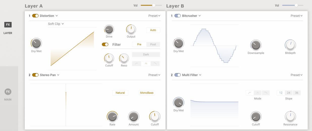 Ach ja, und man kann die Quellen verschieben, so dass man in Layer A nur die Samples nutzt und in Layer B nur die Synths. Prima ist auch, dass jede Quelle ein eigenes Panning hat. Damit kann der Gesamtsound sehr breit sein. Und wem vier Quellen zu viel sind, der deaktiviert diese einfach mit Klick auf das bunte Symbol der Synthese-Form.
