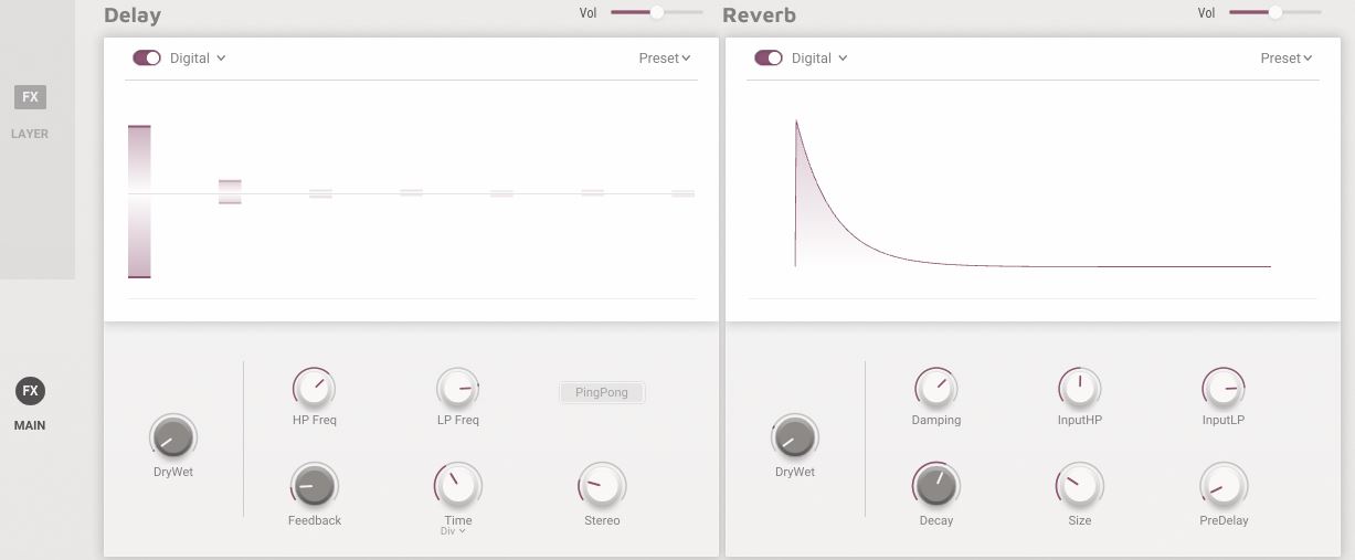 Die Effekte der beiden Layer wandern noch mal in ein Delay und Reverb. Auch diese Effekte sind seriell. Das Delay bietet nicht nur Digital und Tape, sondern auch Pitch Shift. Damit kann jedes Delay leicht verstimmt sein oder direkt um mehrere Töne.