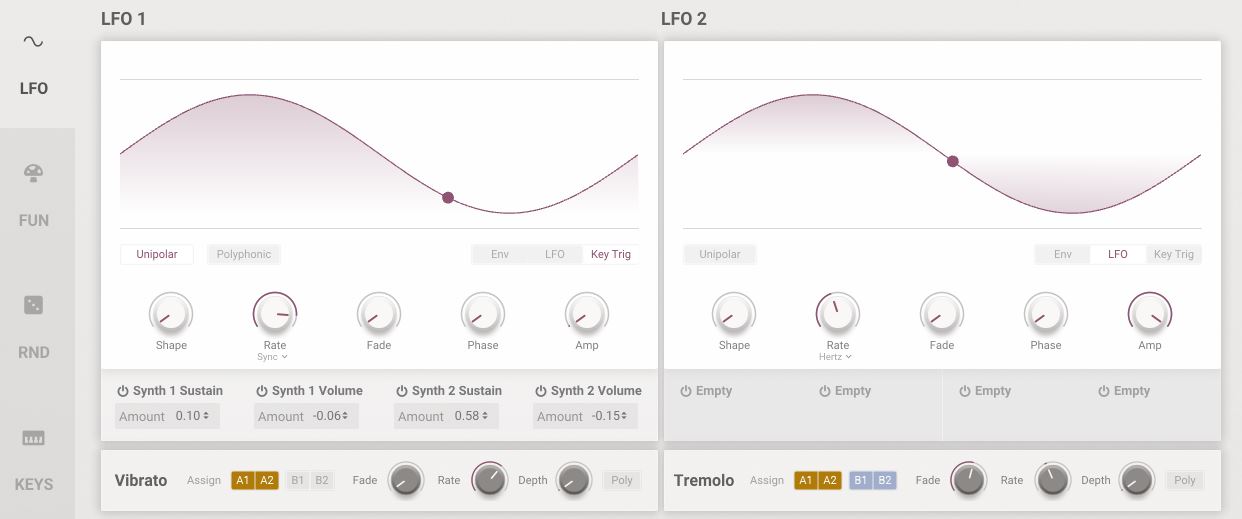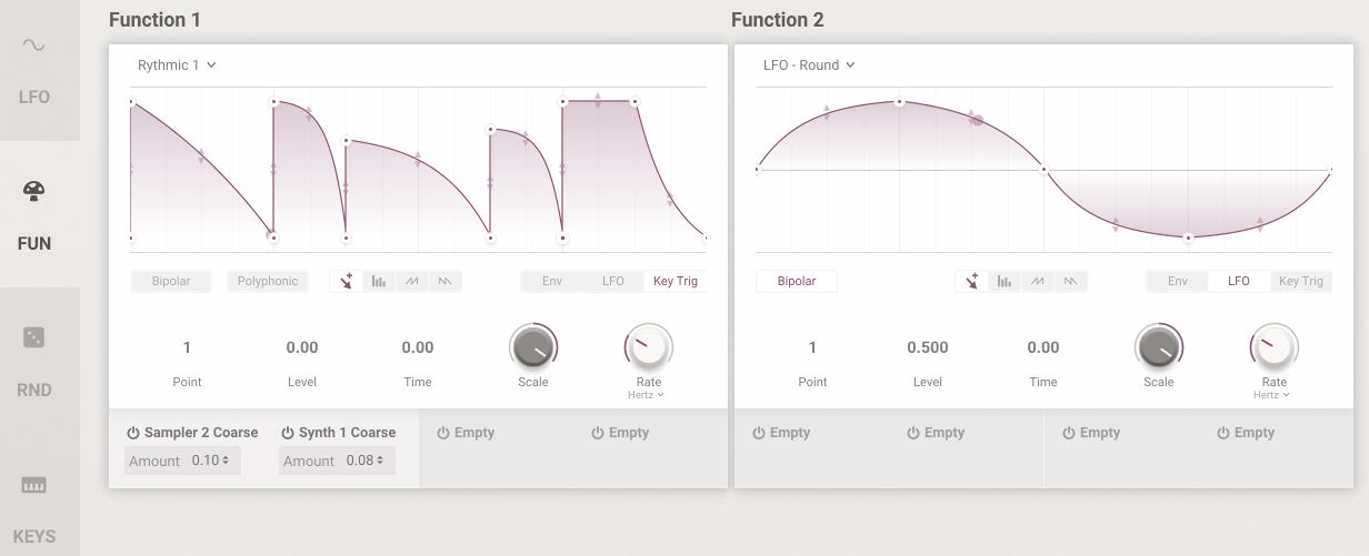 Mit FUN ist nicht nur der Spaß gemeint, sondern die Abkürzung für Function. Hier ist alles möglich, von simplen ADSR-Hüllkurven über LFOs bis hin zu Rhythmic Envelopes. Die Presets geben einen sehr guten Eindruck und man kann einfach hineinklicken und sich sein eigene Rhythmus-Desaster erstellen.