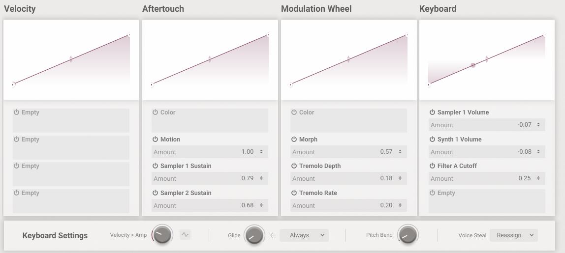 Sehr cool ist, dass die Tonhöhe nicht nur die Tonhöhe ändert (was sonst?), sondern auch noch vier verschiedene Ziele haben kann. Das gibt es auch nicht häufig. Hier findest Du auch die Einstellungen für Glide und Pitchbend.