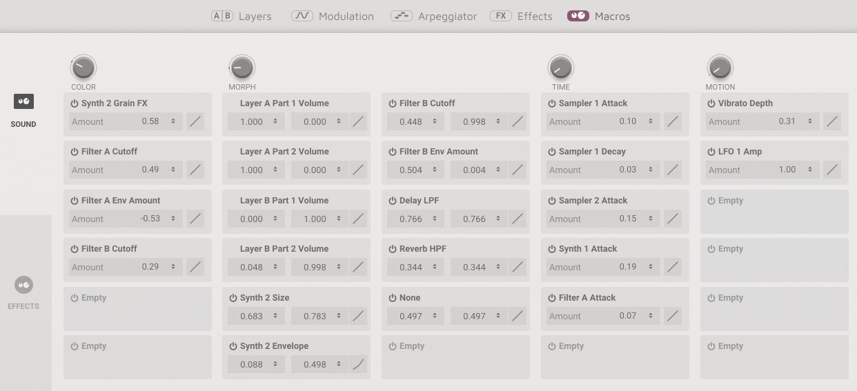 Das oben erwähnte Geheimnis der unberechenbaren Regler sind die Macros. Jedes Macro kann bis zu sechs verschiedene Parameter steuern. Bis auf Morph: Da sind es bis zu 12 Parameter. Ich muss erst mal auf die Idee kommen, welche Parameter ich bei dieser großen Auswahl steuern kann. Die Macros haben zwar Namen, sind im Endeffekt aber nur Vorschläge.