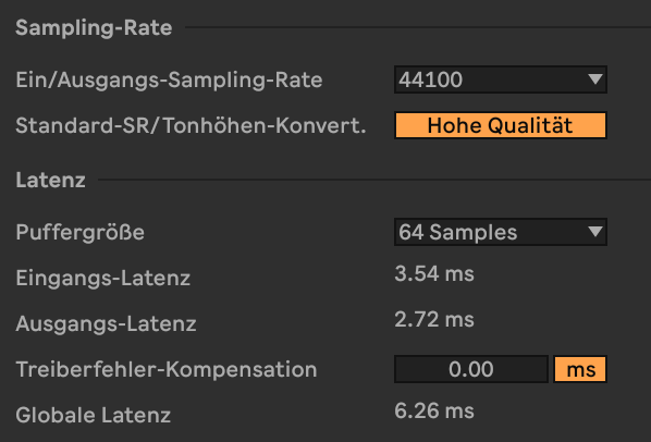 Bei 44.1 sind es 4.6ms Roundtrip. Mit den unnötigen (warum auch immer standardmässig aktivierten) 264 Samples Extra Buffer der obigen Einstellungen sind es 9,1 ms. Das wäre mir auch zu viel.