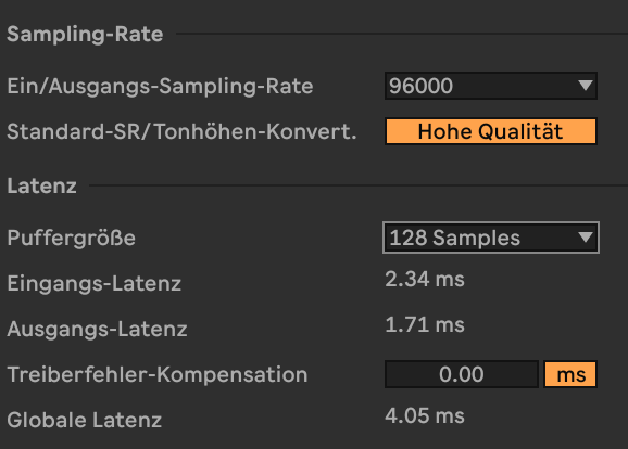 @Dandimite danke für den Tip! Auch wenn ich nicht viel aufnehme, hatte ich mich über die hohe Eingangslatenz gewundert (Twin X quad). Ich hatte in Ableton eine Gesamtlatenz von über 10ms, wobei die Ausgangslatenz mit 2.72ms schon gut war und für mich der wichtigere Wert. Mit den jetzigen Einstellungen sieht das jetzt wie folgt aus: