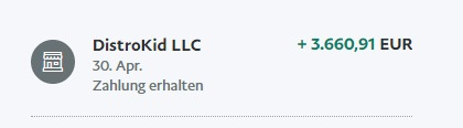 Nachdem jemand mein Audiomaterial gerippt und auf Spotify hochgeladen hatte, es angezweifelt wurde ob mir die 50 EUR die ich bekommen würde was bringen würden, ich mich aber trotzdem nicht beirren lassen habe, habe ich nun heute (fast ein Jahr später) die folgende Zahlung von Distrokid erzhalten: