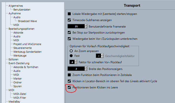 bin erst morgen wieder am Rechner, das probiere ich aus, danke!Programmeinstellungen->Transport->Positionieren beim Klicken ins Leere