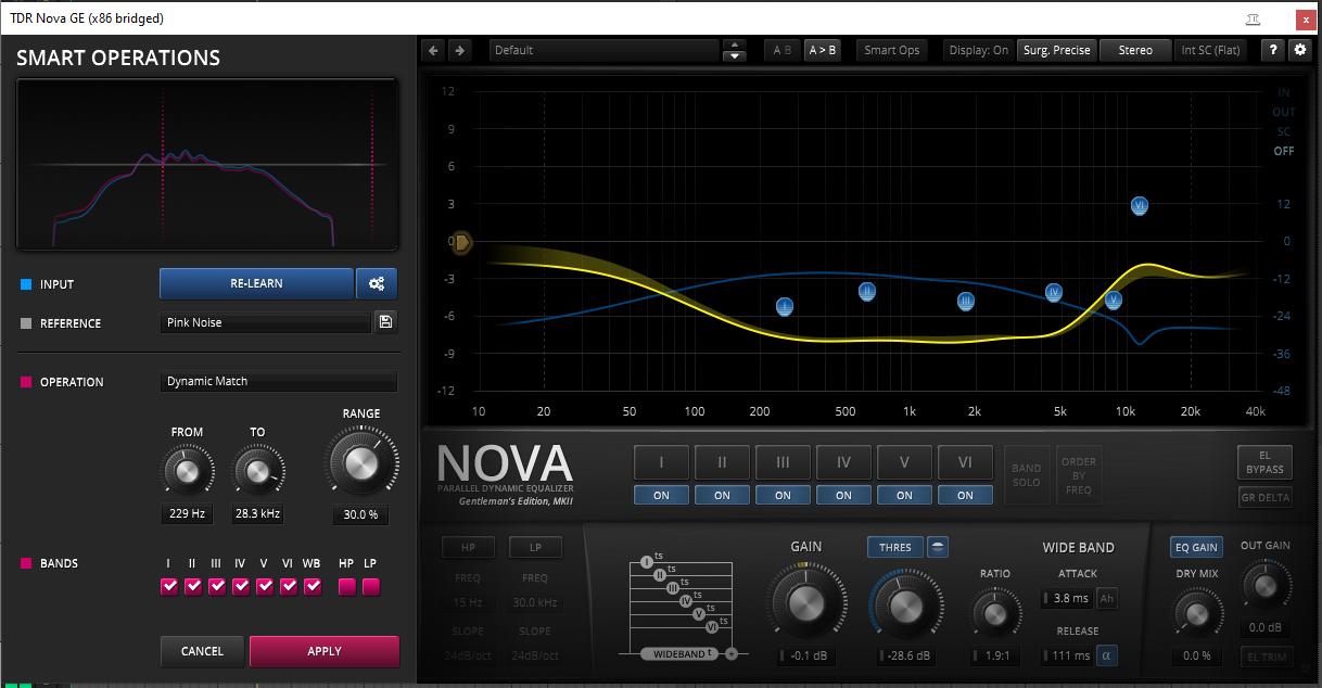 jepp, nova ist ein dynamischer eq. der kann dynamisch gegen pink noise matchen.Ist der Nova hier ein dynamischer eq? Ich denke das ist ein kritischer Bestandteil, damit es klappt. Die Hardware drückt auch nur dann runter wenn es zu viel wird, nicht gleichmäßig und durchgängig.