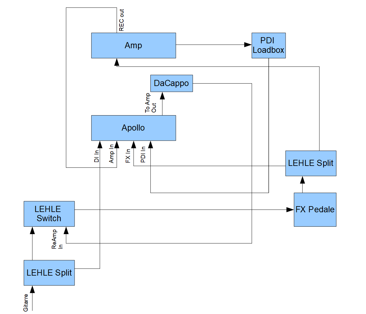 Gitarre geht oben rechts in den Lehle Split und wir da in zwei Signale aufgeteilt: