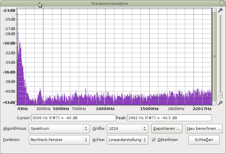 Auch eine FFT Analyse gemacht, keine Auffälligkeiten, nur fast weißes Rauschen mit etwas mehr niederfrequenten Anteilen: