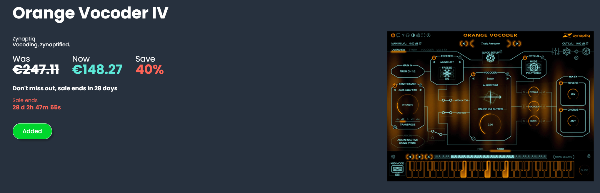 Regular USD 249/EUR 279. Special offer valid through May 31st, 2023. Prices in EUR incl. 19% VAT. EUR 133.61 (intro) or EUR 234.45 (regular) without VAT. Sales Tax may apply to USD price.Also kann man den Orangevocoder 31 Tage zum Angebotspreis kaufen.
